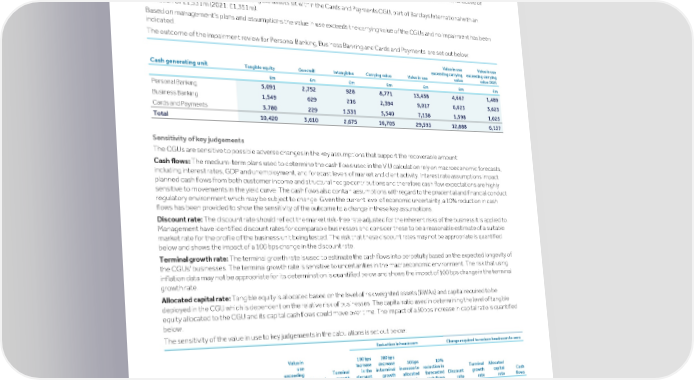 Strategic Shareholder Climate and Risk Financial Financial Barclays PLC 476 report information sustainability report Governance review review statements Annual Report 2022 Notes to the financial statements (continued) Assets at amortised cost and other investments Outcome of goodwill and intangibles review The Personal Banking and Business Banking CGUs carry the majority of the Group’s goodwill balance, predominantly as a consequence of the Woolwich acquisition. The goodwill within Personal Banking was £2,752m (2021: £2,752m), of which £2,501m (2021: £2,501m) was attributable to Woolwich, and within Business Banking was £629m (2021: £629m), fully attributable to Woolwich. The recoverable amount for both Personal Banking and Business Banking have increased in comparison to the 2021 impairment review, reflective of improvements in the interest rate and macroeconomic outlook. The largest portion of the Group’s intangible assets sit within the Cards and Payments CGU, part of Barclays International with an allocation of £1,531m (2021: £1,351m). Based on management’s plans and assumptions the value in use exceeds the carrying value of the CGUs and no impairment has been indicated. The outcome of the impairment review for Personal Banking, Business Banking and Cards and Payments are set out below: Value in use Value in use exceeding carrying exceeding carrying Cash generating unit Tangible equity Goodwill Intangibles Carrying value Value in use value value 2021 £m £m £m £m £m £m £m 5,091 2,752 928 8,771 Personal Banking 13,438 4,667 1,489 1,549 629 216 2,394 Business Banking 9,017 6,623 3,623 Cards and Payments 3,780 229 1,531 5,540 7,138 1,598 1,025 Total 10,420 3,610 2,675 16,705 29,593 12,888 6,137 Sensitivity of key judgements The CGUs are sensitive to possible adverse changes in the key assumptions that support the recoverable amount: Cash flows: The medium-term plans used to determine the cash flows used in the VIU calculation rely on macroeconomic forecasts, including interest rates, GDP and unemployment, and forecast levels of market and client activity. Interest rate assumptions impact planned cash flows from both customer income and structural hedge contributions and therefore cash flow expectations are highly sensitive to movements in the yield curve. The cash flows also contain assumptions with regard to the prudential and financial conduct regulatory environment which may be subject to change. Given the current level of economic uncertainty, a 10% reduction in cash flows has been provided to show the sensitivity of the outcome to a change in these key assumptions. Discount rate: The discount rate should reflect the market risk-free rate adjusted for the inherent risks of the business it is applied to. Management have identified discount rates for comparable businesses and consider these to be a reasonable estimate of a suitable market rate for the profile of the business unit being tested. The risk that these discount rates may not be appropriate is quantified below and shows the impact of a 100 bps change in the discount rate. Terminal growth rate: The terminal growth rate is used to estimate the cash flows into perpetuity based on the expected longevity of the CGUs' businesses. The terminal growth rate is sensitive to uncertainties in the macroeconomic environment. The risk that using inflation data may not be appropriate for its determination is quantified below and shows the impact of 100 bps change in the terminal growth rate. Allocated capital rate: Tangible equity is allocated based on the level of risk weighted assets (RWAs) and capital required to be deployed in the CGU which is dependent on the relative risk of businesses. The capital ratio used in determining the level of tangible equity allocated to the CGU and its capital cash flows could move over time. The impact of a 50bps increase in capital ratio is quantified below. The sensitivity of the value in use to key judgements in the calculations is set out below: Reduction in headroom Change required to reduce headroom to zero Value in 100 bps 100 bps use increase decrease 50 bps 10% exceeding Terminal in the in terminal increase to reduction in Terminal Allocated Carrying Value in carrying Discount growth discount growth allocated forecasted Discount growth capital Cash Cash generating unit value use value rate rate rate rate capital rate cash flows rate rate rate flows £m £m £m % % £m £m £m £m % % % % Personal Banking 8,771 13,438 4,667 16.5 2.0 (944) (596) (279) (1,493) 6.9 (14.8) 8.4 (31.3) Cards and Payments 5,540 7,138 1,598 15.9 2.0 (724) (515) (287) (1,005) 2.5 (3.7) 2.8 (15.9) Total 14,311 20,576 6,265