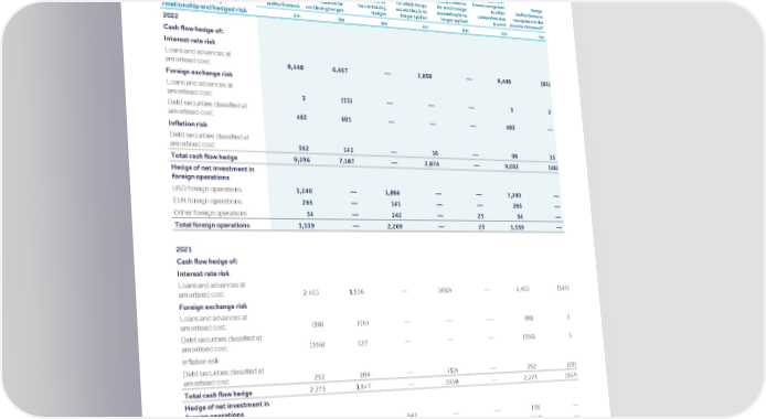 Strategic Shareholder Climate and Risk Financial Financial Barclays PLC 453 report information sustainability report Governance review review statements Annual Report 2022 Notes to the financial statements (continued) Assets and liabilities held at fair value There are 1,796 (2021: 1,782) interest rate risk fair value hedges with an average fixed rate of 1.97% (2021: 1.88%) across the relationships and 94 (2021: 96) inflation risk fair value hedges with an average rate of 0.54% (2021: 0.51%) across the relationships. Hedged items in cash flow hedges and hedges of net investments in foreign operations Balances remaining Balances remaining Change in value of in cash flow in currency Hedging gains or hedged item used Balance in cash Balance in currency hedging reserve translation reserve losses recognised Hedge as the basis for flow hedging translation reserve for which hedge for which hedge in other ineffectiveness recognising reserve for for continuing accounting is no accounting is no comprehensive recognised in the a ineffectiveness continuing hedges hedges longer applied longer applied income income statement Description of hedge relationship and hedged risk £m £m £m £m £m £m £m 2022 Cash flow hedge of: Interest rate risk Loans and advances at amortised cost 8,448 6,457 — 2,858 — 8,448 (83) Foreign exchange risk Loans and advances at amortised cost 3 (13) — — — 3 2 Debt securities classified at amortised cost 483 601 — — — 483 — Inflation risk Debt securities classified at amortised cost 362 142 — 16 — 98 33 Total cash flow hedge 9,296 7,187 — 2,874 — 9,032 (48) Hedge of net investment in foreign operations USD foreign operations 1,240 — 1,886 — — 1,240 — EUR foreign operations 265 — 141 — — 265 — Other foreign operations 34 — 242 — 23 34 — Total foreign operations 1,539 — 2,269 — 23 1,539 — 2021 Cash flow hedge of: Interest rate risk Loans and advances at amortised cost 2,465 1,536 — (492) — 2,465 (347) Foreign exchange risk Loans and advances at amortised cost (88) (16) — — — (88) 1 Debt securities classified at amortised cost (356) 123 — — — (356) 1 Inflation risk Debt securities classified at amortised cost 252 204 — (12) — 252 (22) Total cash flow hedge 2,273 1,847 — (504) — 2,273 (367) Hedge of net investment in foreign operations USD foreign operations 138 — 943 — — 138 — EUR foreign operations (117) — 100 — — (117) — Other foreign operations (3) — 44 — 186 (3) — Total foreign operations 18 — 1,087 — 186 18 — Note a Hedge ineffectiveness is recognised in net interest income.