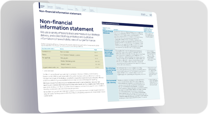 Strategic Shareholder Climate and Risk Financial Financial Barclays PLC 60 report information sustainability report Governance review review statements Annual Report 2022 Non-financial information statement Environmental statements Information to help Non-financial understand our Group and its impact, policies, due Statement or policy diligence and outcomes position Description • See our Climate and The Barclays Position on Climate Change sets out our approach Climate Change information statement Sustainability report based on a consideration of all risk and market factors to certain statement from page 69 in Part 2 energy sectors with higher carbon-related exposures or of the Annual Report. We use a variety of tools to track and measure our strategic emissions from extraction or consumption, or those which may have an impact in certain sensitive environments or on delivery, and collect both quantitative and qualitative communities, namely thermal coal mining, coal-fired power generation, mountain top coal removal, oil sands, Arctic oil and information to have a holistic view of our performance. gas and hydraulic fracturing ('fracking') The statement outlines Barclays' focus on supporting our clients to transition to a low- carbon economy, while helping to limit the threat that climate Certain elements of the non-financial information required pursuant to the Companies Act 2006 change poses to people and to the natural environment. is provided within this Report by reference to the following locations: • See the managing Non-financial information Section Pages We recognise that forestry and agribusiness industries are Forestry and impacts in lending and responsible for producing a range of commodities such as Agricultural Business model Business model 10-11 financing section from timber, palm oil and soy that are often associated with significant Commodities page 246 in Other environmental and social impacts, particularly in relation to Governance within Policies Non-financial information statement 60-62 statement biodiversity loss, tropical deforestation and climate change. Our the Governance Forestry and Agricultural Commodities Statement outlines our report in Part 3 of the Principal Risks Managing risk 56-57 due diligence approach for clients involved in these activities, Annual Report. ensuring that we support clients that promote sustainable Principal Risk management 282-295* forestry and agribusiness practices while respecting the rights of Risk performance 296-369* workers and local communities. Key performance indicators Key performance indicators 23-25 • See our Nature and We understand that industries can impact areas of high World Heritage biodiversity section biodiversity value including United Nations Educational, Scientific Site and Ramsar * in Part 3 of the Report from page 119 within and Cultural Organization (UNESCO) World Heritage Sites and Wetlands our Climate and Ramsar Wetlands. Our statement outlines our client due Sustainability report in The Non-Financial Reporting requirements contained in Sections 414CA and 414CB of the statement diligence approach to preserving and safeguarding these sites. Part 2 of the Annual Companies Act 2006 are addressed within this section by means of cross reference in order to Report. indicate in which part of the strategic narrative the respective requirements are embedded. We have used cross referencing as appropriate to deliver clear, concise and transparent reporting. • See our Climate risk Barclays is committed to managing the direct and indirect Environmental We have a range of policies and guidance (also available at home.barclays/esg-resource-hub/ section within the Risk environmental risks associated with commercial lending. risk in lending review section from reporting-and-disclosures/) that support our key outcomes for all of our stakeholders. Performance Environmental risk is regarded as a credit risk driver, and is page 282 in Part 3 of considered in the Barclays credit risk assessment process against our strategic non-financial performance measures, as shown from page 23, is one indicator of the Annual Report. through our Environmental Risk Standard. A dedicated the effectiveness and outcome of policies and guidance. Environmental and Climate Risk team is responsible for advising Across Barclays, policies and statements of intent are in place to ensure consistent governance on a on environmental and climate related credit risks to Barclays range of issues. For the purposes of the Non-Financial Reporting requirements, these include, but are associated with particular transactions and industries. not limited to: Environmental risks in credit are governed under the Client Assessment and Aggregation Policy and Standard, which are embedded within the Wholesale Credit Risk Control Framework, which is part of the Enterprise Risk Management Framework.