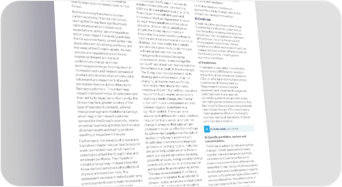 Strategic Shareholder Climate and Risk Financial Financial Barclays PLC 274 report information sustainability report Governance review review statements Annual Report 2022 Material existing and emerging risks (continued) production capacity, increase operating market expectations on a timely basis, may occur on a timely basis, the Group may fail costs, impair asset values and the have a material and adverse impact on the to achieve its climate-related ambitions and targets and this could have a material creditworthiness of customers leading to Group’s level of business growth, increased default rates, delinquencies, competitiveness, profitability, capital adverse effect on the Group’s business, write-offs and impairment charges in requirements, cost of funding, and results of operations, financial condition, Barclays' portfolios. In addition, the financial condition. prospects and reputation. Group’s premises and resilience may also In March 2020, the Group announced its For further details on the Group’s suffer physical damage due to weather approach to climate change, refer to the ambition to become a net zero bank by events leading to increased costs for the 2050 and its commitment to align all of its climate risk management section. Group. financing activities with the goals and ii) Credit risk As the economy transitions to a low- timelines of the Paris Agreement. In order Credit risk is the risk of loss to the Group carbon economy, financial institutions to reach these ambitions and targets or from the failure of clients, customers or such as the Group face significant and any other climate-related ambitions or counterparties, including sovereigns, to rapid developments in stakeholder targets the Group may commit to in fully honour their obligations to members expectations, policy, law and regulation future, the Group will need to continue to of the Group, including the whole and which could impact the lending activities incorporate climate considerations into its timely payment of principal, interest, the Group undertakes, as well as the risks strategy, business model, the products collateral and other receivables. Credit risk associated with its lending portfolios, and and services it provides to customers and is impacted by a number of factors outside the Group’s control, including wider the value of the Group’s assets. As new its financial and non-financial risk economic conditions. policies and regulations are enforced, management processes (including market sentiment and societal processes to measure and manage the a) Impairment preferences change and new various financial and non-financial risks the Impairment is calculated in line with the Group faces as a result of climate change). technologies emerge, this may result in requirements of IFRS9 which results in increased costs and reduced demand of The Group also needs to ensure that its recognition of loss allowances, based on product and services of a company, early strategy and business model adapt to ECLs, on a forward-looking basis using a retirement and impairment of assets, changing, and sometimes conflicting, broad scope of financial metrics. Measurement involves complex decreased revenue and profitability for national and international standards, judgement and impairment charges are industry and scientific practices, regulatory Barclays customers. This in turn may potentially volatile and may not impact creditworthiness of customers and requirements and market expectations successfully predict actual credit losses, their ability to repay loans. Additionally, the regarding climate change, which remain particularly under stressed conditions. Any Group may face greater scrutiny of the under continuous development and vary failure by the Group to accurately estimate type of business it conducts, adverse between regions, sometimes to a credit losses through ECLs could have a significant extent. There can be no media coverage and reputational damage, material adverse effect on the Group's which may in turn impact customer assurance that these standards, practices, business, results of operations, financial demand for the Group's products, returns requirements and expectations will not condition and prospects. on certain business activities and the value change in a manner that substantially of certain assets and trading positions increases the cost or effort for the Group For further details, refer to Note 8. + to achieve such ambitions and targets. In resulting in impairment charges. addition, the Group’s ambitions and b) Specific portfolios, sectors and Furthermore, the impacts of physical and targets may prove more challenging to concentrations transition climate risks can lead to second achieve due to changing circumstances order connected risks, which have the The Group is subject to risks arising from and potentially volatile external factors potential to affect the Group’s retail and changes in credit quality and recovery which are beyond our control, including wholesale portfolios. The impacts of rates for loans and advances due from geopolitical issues, energy security, energy climate change may increase losses for borrowers and counterparties and is poverty and other considerations such as those sectors sensitive to the effects of subject to a concentration of those risks just transition to a low carbon economy. physical and transition risks. Any where the Group has significant exposures This may be exacerbated if the Group subsequent increase in defaults and rising to borrowers and counterparties in specific chooses or is required to accelerate its unemployment could create recessionary sectors, or to particular types of borrowers climate-related ambitions or targets as a pressures, which may lead to wider and counterparties. Any deterioration in result of UK or international regulatory deterioration in the creditworthiness of the the credit quality of such borrowers and developments or stakehold