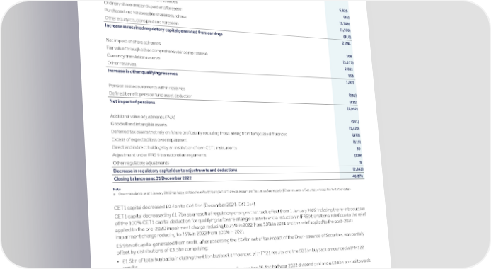 Strategic Shareholder Climate and Risk Financial Financial Barclays PLC 358 report information sustainability report Governance review review statements Annual Report 2022 Risk performance - Treasury and Capital risk (continued) Movement in CET1 capital 2022 £m a Opening balance as at 1 January 2022 47,327 Profit for the period attributable to equity holders 5,928 Own credit relating to derivative liabilities (85) Ordinary share dividends paid and foreseen (1,149) Purchased and foreseeable share repurchase (1,500) Other equity coupons paid and foreseen (910) Increase in retained regulatory capital generated from earnings 2,284 Net impact of share schemes 108 Fair value through other comprehensive income reserve (1,277) Currency translation reserve 2,032 Other reserves 138 Increase in other qualifying reserves 1,001 Pension remeasurements within reserves (281) Defined benefit pension fund asset deduction (811) Net impact of pensions (1,092) Additional value adjustments (PVA) (141) Goodwill and intangible assets (1,420) Deferred tax assets that rely on future profitability excluding those arising from temporary differences (472) Excess of expected loss over impairment (119) Direct and indirect holdings by an institution of own CET1 instruments 30 Adjustment under IFRS 9 transitional arrangements (529) Other regulatory adjustments 9 Decrease in regulatory capital due to adjustments and deductions (2,642) Closing balance as at 31 December 2022 46,878 Note a Opening balance as at 1January 2022 has been restated to reflect the impact of the Over-issuance of Securities.See Impact of Over-issuance of Securities on page 356 for further details. CET1 capital decreased £0.4bn to £46.9bn (December 2021: £47.3bn). CET1 capital decreased by £1.7bn as a result of regulatory changes that took effect from 1 January 2022 including the re-introduction of the 100% CET1 capital deduction for qualifying software intangible assets and a reduction in IFRS9 transitional relief due to the relief applied to the pre-2020 impairment charge reducing to 25% in 2022 from 50% in 2021 and the relief applied to the post-2020 impairment charge reducing to 75% in 2022 from 100% in 2021. £5.9bn of capital generated from profit, after absorbing the £0.6bn net of tax impact of the Over-issuance of Securities, was partially offset by distributions of £3.5bn comprising: • £1.5bn of total buybacks including the £1bn buyback announced with FY21 results and the £0.5bn buyback announced with H122 results • £1.1bn of ordinary share dividends paid and foreseen reflecting the £0.4bn half year 2022 dividend paid and a £0.8bn accrual towards a full year 2022 dividend • £0.9bn of equity coupons paid and foreseen Other significant movements in the period were: • £1.3bn reduction from decreases in the fair value of the bond portfolio through other comprehensive income • £2.0bn increase in the currency translation reserve driven by the appreciation of period end USD against GBP • £1.1bn decrease due to the net impact of pensions primarily as a result of the accelerated cash settlement to the UKRF of earlier deficit reduction contributions as well as deficit reduction payments made in 2022