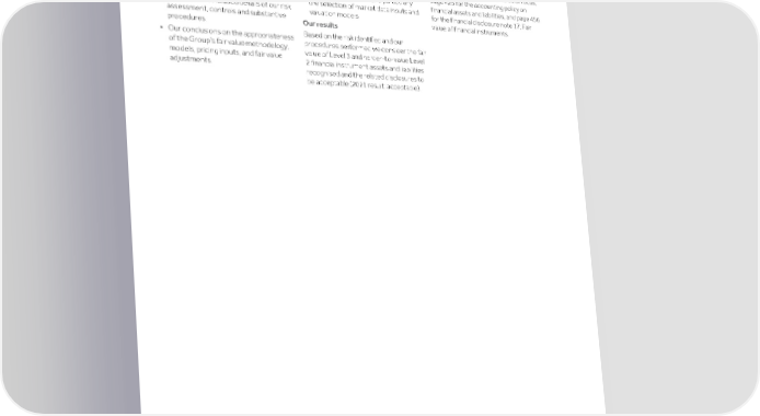 Strategic Shareholder Climate and Risk Financial Financial Barclays PLC 406 report information sustainability report Governance review review statements Annual Report 2022 KPMG LLP’s independent auditor’s report to the members of Barclays PLC (continued) Communications with the Barclays PLC Areas of particular auditor judgement Further information in the Annual Report Board Audit Committee and Accounts: See the Board Audit We identified the following as the areas of Our discussions with and reporting to the Committee Report on page 173 for details particular auditor judgement: Board Audit Committee included: on how the Board Audit Committee • The appropriateness of the valuation of considered Valuations as an area of focus, • Our approach to the audit of the fair harder to value Level 2 and Level 3 page 425 for the accounting policy on value of Level 3 and harder-to-value financial instruments, and particularly financial assets and liabilities, and page 456 Level 2 financial instrument assets and the selection of market data inputs and for the financial disclosure note 17; Fair liabilities. This included details of our risk valuation models. value of financial instruments. assessment, controls and substantive Our results procedures. Based on the risk identified and our • Our conclusions on the appropriateness procedures performed we consider the fair of the Group’s fair value methodology, value of Level 3 and harder-to-value Level models, pricing inputs, and fair value 2 financial instrument assets and liabilities adjustments. recognised and the related disclosures to be acceptable (2021 result: acceptable).