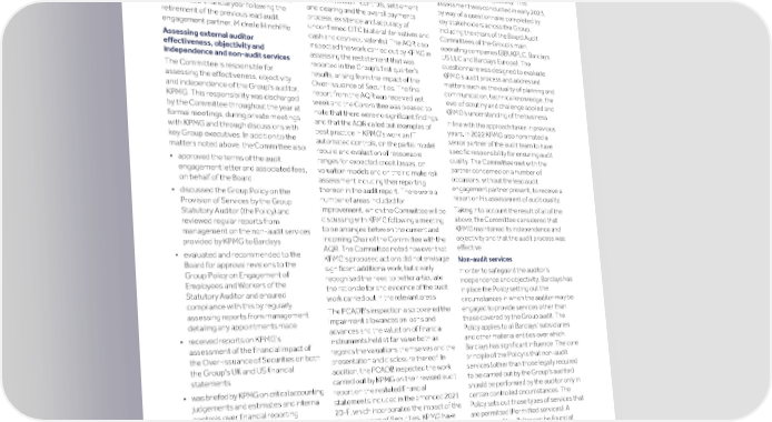 Strategic Shareholder Climate and Risk Financial Financial Barclays PLC 176 report information sustainability report Governance review review statements Annual Report 2022 Directors’ report: Board Audit Committee report (continued) The AQR inspection covered three key specific country which did not specify their External auditor audit matters (impairment allowances on legal names. Following an external audit tender in 2015, loans and advances, valuation of financial The Group undertakes an annual formal KPMG was appointed as Barclays’ instruments held at fair value and IT user assessment of KPMG’s performance, statutory auditor with effect from the access management) as well as four other independence and objectivity. This 2017 financial year. Stuart Crisp of KPMG is areas of audit focus (general IT controls assessment was conducted in early 2023, Barclays’ lead audit engagement partner and automated IT controls, settlement by way of a questionnaire completed by and was appointed to this role with effect and clearing and the overall payments key stakeholders across the Group, for the 2022 financial year following the process, existence and accuracy of including the chairs of the Board Audit retirement of the previous lead audit unconfirmed OTC bilateral derivatives and Committees of the Group’s main engagement partner, Michelle Hinchliffe. cash and cash equivalents). The AQR also operating companies (BBUKPLC, Barclays Assessing external auditor inspected the work carried out by KPMG in US LLC and Barclays Europe). The effectiveness, objectivity and assessing the restatement that was questionnaire was designed to evaluate independence and non-audit services reported in the Group's first quarter’s KPMG’s audit process and addressed The Committee is responsible for results, arising from the impact of the matters such as the quality of planning and assessing the effectiveness, objectivity Over-issuance of Securities. The final communication, technical knowledge, the and independence of the Group’s auditor, report from the AQR was received last level of scrutiny and challenge applied and KPMG. This responsibility was discharged week and the Committee was pleased to KPMG’s understanding of the business. by the Committee throughout the year at note that there were no significant findings In line with the approach taken in previous formal meetings, during private meetings and that the AQR called out examples of years, in 2022 KPMG also nominated a with KPMG and through discussions with best practice in KPMG’s work on IT senior partner of the audit team to have key Group executives. In addition to the automated controls, on the partial model specific responsibility for ensuring audit matters noted above, the Committee also: rebuild and evaluation of reasonable quality. The Committee met with the • approved the terms of the audit ranges for expected credit losses, on partner concerned on a number of engagement letter and associated fees, valuation models and on their climate risk occasions, without the lead audit on behalf of the Board assessment including their reporting engagement partner present, to receive a thereon in the audit report. There were a • discussed the Group Policy on the report on his assessment of audit quality. number of areas included for Provision of Services by the Group Taking into account the result of all of the improvement, which the Committee will be Statutory Auditor (the Policy) and above, the Committee considered that discussing with KPMG following a meeting reviewed regular reports from KPMG maintained its independence and to be arranged between the current and management on the non-audit services objectivity and that the audit process was incoming Chair of the Committee with the provided by KPMG to Barclays effective. AQR. The Committee noted however that • evaluated and recommended to the KPMG’s proposed actions did not envisage Non-audit services Board for approval revisions to the significant additional work, but clearly In order to safeguard the auditor’s Group Policy on Engagement of recognised the need to better articulate independence and objectivity, Barclays has Employees and Workers of the the rationale for and evidence of the audit in place the Policy setting out the Statutory Auditor and ensured work carried out in the relevant areas. circumstances in which the auditor may be compliance with this by regularly The PCAOB’s inspection also covered the engaged to provide services other than assessing reports from management impairment allowances on loans and those covered by the Group audit. The detailing any appointments made advances and the valuation of financial Policy applies to all Barclays’ subsidiaries • received reports on KPMG’s instruments held at fair value both as and other material entities over which assessment of the financial impact of regards the valuations themselves and the Barclays has significant influence. The core the Over-issuance of Securities on both presentation and disclosure thereof. In principle of the Policy is that non-audit the Group's UK and US financial addition, the PCAOB inspected the work services (other than those legally required statements carried out by KPMG on their revised audit to be carried out by the Group’s auditor) • was briefed by KPMG on critical accounting report on the restated financial should be performed by the auditor only in judgements and estimates and internal statements included in the amended 2021 certain controlled circumstances. The controls over financial reporting 20-F, which incorporated the impact of the Policy sets out those types of services that Over-issuance of Securities. KPMG have are permitted (Permitted services). A • met with senior members of the KPMG not yet received a report from the PCAOB, summary of the Policy can be found at Barclays team both from the UK and US but have informed us that the PCAOB home.barclays/who-we-are/our- to d