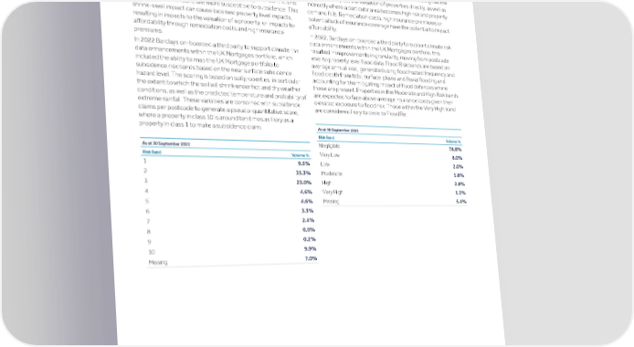 Strategic Shareholder Climate and Risk Financial Financial Barclays PLC 299 report information sustainability report Governance review review statements Annual Report 2022 Risk performance - Climate risk (continued) Subsidence: Total Volume of stock (as % of total UK Mortgage Flood: Total Volume of stock (as % of total UK Mortgage book) book) per risk band per risk band Subsidence is driven by the interplay of precipitation, temperature Flooding in the UK is forecast to increase over time, with the and soil type factors, which result in volumetric changes to the potential for this increase to accelerate if greenhouse gas soil. Increased volatility in weather conditions, as a result of emissions are not reduced. The increased risk of flooding has the climate change, contributes to the acceleration of subsidence potential to impact the valuation of properties directly, as well as impacts. Some areas, particularly those with high concentrations indirectly where a particular area becomes high risk and property of clay soil (i.e. London), are more susceptible to subsidence. This demand falls. Remediation costs, high insurance premiums or shrink-swell impact can cause localised property level impacts, potential lack of insurance coverage have the potential to impact resulting in impacts to the valuation of a property, or impacts to affordability. affordability through remediation costs and high insurance In 2022, Barclays on-boarded a third party to support climate risk premiums. data enhancements within the UK Mortgages portfolio, this resulted in improvements in granularity, moving from postcode In 2022 Barclays on-boarded a third party to support climate risk level to property level flood data. Flood Risk bands are based on data enhancements within the UK Mortgages portfolio, which average annual loss, generated using flood hazard frequency and included the ability to map the UK Mortgage portfolio to flood depth from tidal, surface, pluvial and fluvial flooding and subsidence risk bands based on the near surface subsidence accounting for the mitigating impact of flood defences where hazard level. The scoring is based on soil properties, in particular these are present. Properties in the Moderate and High Risk bands the extent to which the soil will shrink under hot and dry weather are expected to face above average insurance costs given their conditions, as well as the predicted temperature and probability of elevated exposure to flood risk. Those within the Very High band extreme rainfall. These variables are combined with subsidence are considered likely to cede to Flood Re. claims per postcode to generate a pseudo-quantitative score, where a property in class 10 is around ten times as likely as a As at 30 September 2022 property in class 1 to make a subsidence claim. Risk Band Volume % Negligible 78.8% As at 30 September 2022 Very Low 8.0% Risk Band Volume % 1 9.5% Low 2.0% 2 35.3% Moderate 1.8% 3 23.0% High 2.8% 4 4.6% Very High 1.3% 5 4.6% Missing 5.4% 6 3.3% 7 2.4% 8 0.0% 9 0.2% 10 9.9% Missing 7.0%