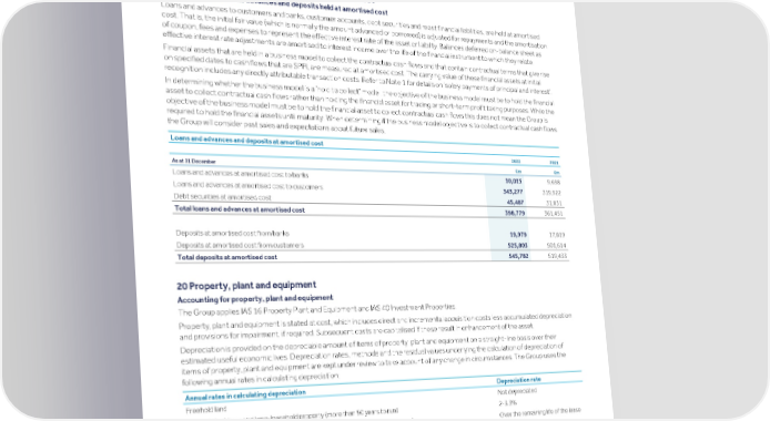 Strategic Shareholder Climate and Risk Financial Financial Barclays PLC 469 report information sustainability report Governance review review statements Annual Report 2022 Notes to the financial statements (continued) Assets at amortised cost and other investments Assets at amortised cost and other investments The notes included in this section focus on the Group’s loans and advances and deposits at amortised cost, leases, property, plant and equipment and goodwill and intangible assets. Details regarding the Group’s liquidity and capital position can be found in the Treasury and Capital risk section. 19 Loans and advances and deposits at amortised cost Accounting for loans and advances and deposits held at amortised cost Loans and advances to customers and banks, customer accounts, debt securities and most financial liabilities, are held at amortised cost. That is, the initial fair value (which is normally the amount advanced or borrowed) is adjusted for repayments and the amortisation of coupon, fees and expenses to represent the effective interest rate of the asset or liability. Balances deferred on-balance sheet as effective interest rate adjustments are amortised to interest income over the life of the financial instrument to which they relate. Financial assets that are held in a business model to collect the contractual cash flows and that contain contractual terms that give rise on specified dates to cash flows that are SPPI, are measured at amortised cost. The carrying value of these financial assets at initial recognition includes any directly attributable transaction costs. Refer to Note 1 for details on ‘solely payments of principal and interest’. In determining whether the business model is a ‘hold to collect’ model, the objective of the business model must be to hold the financial asset to collect contractual cash flows rather than holding the financial asset for trading or short-term profit taking purposes. While the objective of the business model must be to hold the financial asset to collect contractual cash flows this does not mean the Group is required to hold the financial assets until maturity. When determining if the business model objective is to collect contractual cash flows the Group will consider past sales and expectations about future sales. Loans and advances and deposits at amortised cost 2022 2021 As at 31 December £m £m Loans and advances at amortised cost to banks 10,015 9,698 Loans and advances at amortised cost to customers 343,277 319,922 Debt securities at amortised cost 45,487 31,831 Total loans and advances at amortised cost 398,779 361,451 Deposits at amortised cost from banks 19,979 17,819 Deposits at amortised cost from customers 525,803 501,614 Total deposits at amortised cost 545,782 519,433 20 Property, plant and equipment Accounting for property, plant and equipment The Group applies IAS 16 Property Plant and Equipment and IAS 40 Investment Properties. Property, plant and equipment is stated at cost, which includes direct and incremental acquisition costs less accumulated depreciation and provisions for impairment, if required. Subsequent costs are capitalised if these result in enhancement of the asset. Depreciation is provided on the depreciable amount of items of property, plant and equipment on a straight-line basis over their estimated useful economic lives. Depreciation rates, methods and the residual values underlying the calculation of depreciation of items of property, plant and equipment are kept under review to take account of any change in circumstances. The Group uses the following annual rates in calculating depreciation: Annual rates in calculating depreciation Depreciation rate Freehold land Not depreciated Freehold buildings and long-leasehold property (more than 50 years to run) 2-3.3% Leasehold property over the remaining life of the lease (less than 50 years to run) Over the remaining life of the lease Costs of adaptation of freehold and leasehold property 6-10% Equipment installed in freehold and leasehold property 6-10% Computers and similar equipment 17-33% Fixtures and fittings and other equipment 9-20% Costs of adaptation and installed equipment are depreciated over the shorter of the life of the lease or the depreciation rates noted in the table above. Investment property The Group initially recognises investment property at cost, and subsequently at fair value at each balance sheet date, reflecting market conditions at the reporting date. Gains and losses on remeasurement are included in the income statement.
