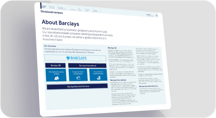 Strategic Shareholder Climate and Risk Financial Financial Barclays PLC 48 report information sustainability report Governance review review statements Annual Report 2022 Divisional reviews About Barclays We are diversified by business, geography and income type. Our operations include consumer banking and payment services in the UK, US and Europe, as well as a global corporate and investment bank. The Consumer, Cards and Payments division of Our structure Barclays UK Barclays International is comprised of our Barclays UK consists of our UK Personal Banking, Barclays operates as two divisions, Barclays UK and Barclays International, International Cards and Consumer Bank, Private UK Business Banking and Barclaycard Consumer Bank and Barclaycard Payments businesses. supported by our service company, Barclays Execution Services. UK businesses. These businesses are carried on by our UK ring-fenced bank (Barclays Bank UK PLC) As part of our International Cards and Consumer and certain other entities within the Barclays Group. Bank, in the US we have a partnership-focused business model, offering credit cards to consumers UK Personal Banking offers retail solutions to help through our relationships. We also offer online customers with their day-to-day banking needs. retail savings products, instalment payments and personal loans. UK Business Banking serves business clients, from high-growth start-ups to small and medium-sized In Germany, we offer multiple consumer products enterprises, with specialist advice for their business including own-branded and co-branded credit cards, banking needs. online loans, electronic Point of Sale (ePOS) financing and deposits. Barclaycard Consumer UK is a leading credit card provider, offering flexible borrowing and payment Barclaycard Payments enables businesses of all sizes solutions, while seeking to deliver a leading customer to make and receive payments. experience. Our Private Bank offers banking, credit and Barclays International investment capabilities to meet the needs of our clients across the UK, Europe, the Middle East and Barclays International consists of our Corporate and Africa, and Asia. Investment Bank and Consumer, Cards and Payments businesses. These businesses operate Barclays Execution Services within our non ring-fenced bank (Barclays Bank PLC) and its subsidiaries, and certain other entities within Barclays Execution Services is the Group-wide the Group. service company providing technology, operations and functional services to businesses across Barclays Corporate and Investment Bank is the Group. comprised of the Investment Banking, Corporate Banking and Global Markets businesses, aiding money managers, financial institutions, governments, supranational organisations and corporate clients to manage their funding, financing, strategic and risk management needs.