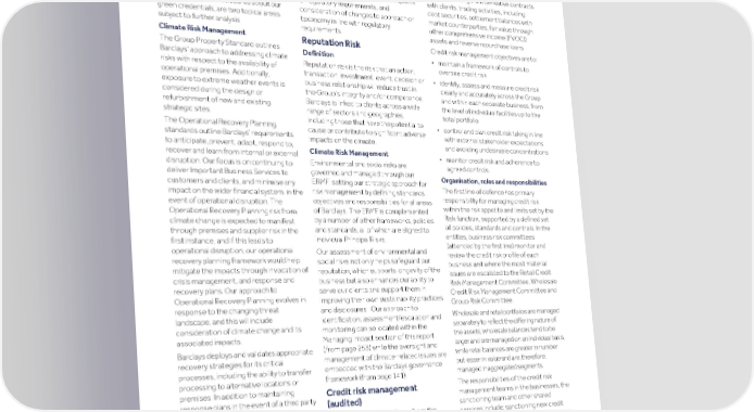 Strategic Shareholder Climate and Risk Financial Financial Barclays PLC 289 report information sustainability report Governance review review statements Annual Report 2022 Principal risk management (continued) implications could be an incremental operational risk profile through business as Overview factor. The potential effect of climate usual activities. The credit risk that the Group faces arises change has been considered qualitatively This includes working with Premises and from wholesale and retail loans and in the latest scenario assessment cycle, Operational Recovery Planning Horizontal advances together with the counterparty where climate has been found not to be an Owners to identify and respond to any new credit risk arising from derivative contracts immediate factor impacting most emerging climate change related impacts with clients; trading activities, including: scenarios, although greenwashing at or regulatory requirements, and debt securities, settlement balances with product level, and disclosures about our consideration of changes to approach or market counterparties, fair value through green credentials, are two topical areas taxonomy in line with regulatory other comprehensive income (FVOCI) subject to further analysis. requirements. assets and reverse repurchase loans. Climate Risk Management Reputation Risk Credit risk management objectives are to: The Group Property Standard outlines Definition • maintain a framework of controls to Barclays’ approach to addressing climate oversee credit risk Reputation risk is the risk that an action, risks with respect to the availability of transaction, investment, event, decision or • identify, assess and measure credit risk operational premises. Additionally, business relationship will reduce trust in clearly and accurately across the Group exposure to extreme weather events is the Group’s integrity and/or competence. and within each separate business, from considered during the design or Barclays is linked to clients across a wide the level of individual facilities up to the refurbishment of new and existing range of sectors and geographies, total portfolio strategic sites. including those that have the potential to • control and plan credit risk taking in line The Operational Recovery Planning cause or contribute to significant adverse with external stakeholder expectations standards outline Barclays’ requirements impacts on the climate. and avoiding undesirable concentrations to anticipate, prevent, adapt, respond to, Climate Risk Management recover and learn from internal or external • monitor credit risk and adherence to Environmental and social risks are disruption. Our focus is on continuing to agreed controls. governed and managed through our deliver Important Business Services to Organisation, roles and responsibilities ERMF, setting our strategic approach for customers and clients, and minimise any The first line of defence has primary risk management by defining standards, impact on the wider financial system, in the responsibility for managing credit risk objectives and responsibilities for all areas event of operational disruption. The within the risk appetite and limits set by the of Barclays. The ERMF is complemented Operational Recovery Planning risk from Risk function, supported by a defined set by a number of other frameworks, policies climate change is expected to manifest of policies, standards and controls. In the and standards, all of which are aligned to through premises and supplier risk in the entities, business risk committees individual Principal Risks. first instance, and if this leads to (attended by the first line) monitor and operational disruption, our operational Our assessment of environmental and review the credit risk profile of each recovery planning framework would help social risks not only helps safeguard our business unit where the most material mitigate the impacts through invocation of reputation, which supports longevity of the issues are escalated to the Retail Credit crisis management, and response and business but also enhances our ability to Risk Management Committee, Wholesale recovery plans. Our approach to serve our clients and support them in Credit Risk Management Committee and Operational Recovery Planning evolves in improving their own sustainability practices Group Risk Committee. response to the changing threat and disclosures. Our approach to Wholesale and retail portfolios are managed landscape, and this will include identification, assessment/escalation and separately to reflect the differing nature of consideration of climate change and its monitoring can be located within the the assets; wholesale balances tend to be associated impacts. Managing Impact section of this report larger and are managed on an individual basis, (from page 253) while the oversight and Barclays deploys and validates appropriate while retail balances are greater in number management of climate-related issues are recovery strategies for its critical but lesser in value and are, therefore, embedded with the Barclays governance processes, including the ability to transfer managed in aggregated segments. framework (from page 141). processing to alternative locations or The responsibilities of the credit risk premises. In addition to maintaining Credit risk management management teams in the businesses, the response plans in the event of a third party (audited) sanctioning team and other shared disruption, for our third party service The risk of loss to the Group from the services include: sanctioning new credit providers Operational Recovery Planning failure of clients, customers or agreements (principally wholesale); setting requirements are articulated through our counterparties, including sovereigns, to strategies for approval of transactions Supplier Control Obligations (SCOs). Each fully honour their obligations to the Group, (principally retail); setting risk appetite; third pa