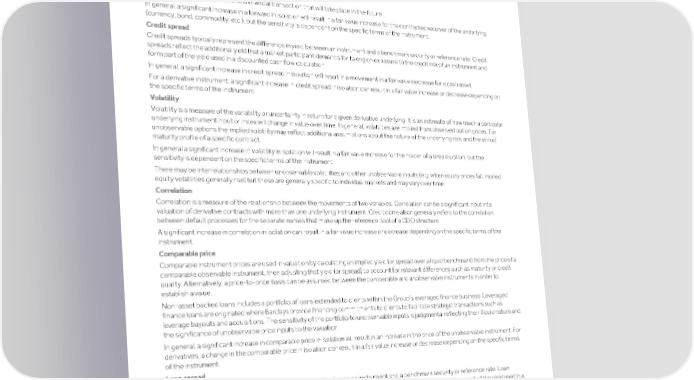 Strategic Shareholder Climate and Risk Financial Financial Barclays PLC 464 report information sustainability report Governance review review statements Annual Report 2022 Notes to the financial statements (continued) Assets and liabilities held at fair value The following section describes the significant unobservable inputs identified in the table above, and the sensitivity of fair value measurement of the instruments categorised as Level 3 assets or liabilities to increases in significant unobservable inputs. Where sensitivities are described, the inverse relationship will also generally apply. Where reliable interrelationships can be identified between significant unobservable inputs used in fair value measurement, a description of those interrelationships is included below. Forwards A price or rate that is applicable to a financial transaction that will take place in the future. In general, a significant increase in a forward in isolation will result in a fair value increase for the contracted receiver of the underlying (currency, bond, commodity, etc.), but the sensitivity is dependent on the specific terms of the instrument. Credit spread Credit spreads typically represent the difference in yield between an instrument and a benchmark security or reference rate. Credit spreads reflect the additional yield that a market participant demands for taking on exposure to the credit risk of an instrument and form part of the yield used in a discounted cash flow calculation. In general, a significant increase in credit spread in isolation will result in a movement in a fair value decrease for a cash asset. For a derivative instrument, a significant increase in credit spread in isolation can result in a fair value increase or decrease depending on the specific terms of the instrument. Volatility Volatility is a measure of the variability or uncertainty in return for a given derivative underlying. It is an estimate of how much a particular underlying instrument input or index will change in value over time. In general, volatilities are implied from observed option prices. For unobservable options the implied volatility may reflect additional assumptions about the nature of the underlying risk, and the strike/ maturity profile of a specific contract. In general a significant increase in volatility in isolation will result in a fair value increase for the holder of a simple option, but the sensitivity is dependent on the specific terms of the instrument. There may be interrelationships between unobservable volatilities and other unobservable inputs (e.g. when equity prices fall, implied equity volatilities generally rise) but these are generally specific to individual markets and may vary over time. Correlation Correlation is a measure of the relationship between the movements of two variables. Correlation can be a significant input into valuation of derivative contracts with more than one underlying instrument. Credit correlation generally refers to the correlation between default processes for the separate names that make up the reference pool of a CDO structure. A significant increase in correlation in isolation can result in a fair value increase or decrease depending on the specific terms of the instrument. Comparable price Comparable instrument prices are used in valuation by calculating an implied yield (or spread over a liquid benchmark) from the price of a comparable observable instrument, then adjusting that yield (or spread) to account for relevant differences such as maturity or credit quality. Alternatively, a price-to-price basis can be assumed between the comparable and unobservable instruments in order to establish a value. Non-asset backed loans includes a portfolio of loans extended to clients within the Group’s leveraged finance business. Leveraged finance loans are originated where Barclays provide financing commitments to clients to facilitate strategic transactions such as leverage buyouts and acquisitions. The sensitivity of the portfolio to unobservable inputs is judgmental reflecting their illiquid nature and the significance of unobservable price inputs to the valuation. In general, a significant increase in comparable price in isolation will result in an increase in the price of the unobservable instrument. For derivatives, a change in the comparable price in isolation can result in a fair value increase or decrease depending on the specific terms of the instrument. Loan spread Loan spreads typically represent the difference in yield between an instrument and a benchmark security or reference rate. Loan spreads typically reflect credit quality, the level of comparable assets such as gilts and other factors, and form part of the yield used in a discounted cash flow calculation. Non-asset backed loans contains a portfolio primarily consisting of long-dated fixed rate loans extended to counterparties in the UK Education, Social Housing and Local Authority sectors (ESHLA). The loans are categorised as Level 3 in the fair value hierarchy due to their illiquid nature and the significance of unobservable loan spreads to the valuation. Valuation uncertainty arises from the long-dated nature of the portfolio, the lack of secondary market in the loans and the lack of observable loan spreads. The majority of ESHLA loans are to borrowers in heavily regulated sectors that are considered extremely low credit risk, and have a history of near zero defaults since inception. While the overall loan spread range is from 50bps to 589bps (2021: 31bps to 1,552bps), the vast majority of spreads are concentrated towards the bottom end of this range, with 88% of the loan notional being valued with spreads less than 200bps consistently for both years. In general, a significant increase in loan spreads in isolation will result in a fair value decrease for a loan.