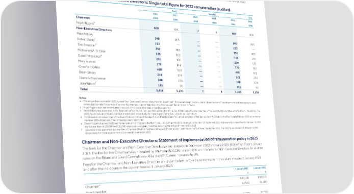 Strategic Shareholder Climate and Risk Financial Financial Barclays PLC 240 report information sustainability report Governance review review statements Annual Report 2022 Remuneration report (continued) Chairman and Non-Executive Directors Remuneration for Non-Executive Directors reflects their responsibilities, time commitment and the level of fees paid to Non-Executive Directors of comparable major UK companies. Fees are pro-rated for periods of service. Non-Executive Directors are reimbursed expenses that are incurred for business reasons. Any tax that arises on these reimbursed expenses is paid by Barclays. Chairman and Non-Executive Directors: Single total figure for 2022 remuneration (audited) a Fees Benefits Total 2021 2022 2021 2022 2021 2022 £000 £000 £000 £000 £000 £000 Chairman b Nigel Higgins 800 800 7 8 807 808 Non-Executive Directors Mike Ashley 260 265 — — 260 265 c Robert Berry 213 — — — 213 — d Tim Breedon 392 483 — — 392 483 Mohamed A. El-Erian 155 150 — — 155 150 e Dawn Fitzpatrick 200 170 — — 200 170 Mary Francis 170 162 — — 170 162 Crawford Gillies 490 502 — — 490 502 Brian Gilvary 241 234 — — 241 234 Diane Schueneman 388 374 — — 388 374 f Julia Wilson 135 90 — — 135 90 Total 3,444 3,230 7 8 3,451 3,238 Notes a The annual fees received in 2022 by each Non-Executive Director include fees for Board Committee memberships and/or subsidiary Board positions. Fees shown in the table above are pro-rated (where appropriate) for periods of service. Key changes in appointments during 2022 are identified in notes c to f below. b Nigel Higgins does not receive a fee in respect of his role as Chairman of Barclays Bank PLC. c Robert Berry was appointed to the Board with effect from 8 February 2022 and as Chair of the Board Risk Committee and a member of the Board Audit Committee with effect from 1 March 2022. The 2022 figure includes £90,000, £80,000 and £20,000 respectively, for these appointments (pro-rated for service in 2022). d Tim Breedon retired as Chair of the Board Risk Committee of Barclays PLC and Barclays Bank PLC, and as a member of the Barclays Bank PLC Board, with effect from 28 February 2022, but remains a member of the Board and Chair of Barclays Bank Ireland PLC. e Dawn Fitzpatrick joined the Board Remuneration Committee with effect from 1 July 2021 and the BCSL Board with effect from 27 September 2021 and received pro-rated fees for that year. For 2022, the full year fees of £30,000 and £20,000 respectively were paid, therefore increasing the fees paid from 2021 to 2022. f Julia Wilson was appointed as a member of the Board Risk Committee and the Board Nominations Committee with effect from 1 September 2022. The 2022 figure includes £30,000 and £15,000 respectively for these appointments (pro-rated for service in 2022). Chairman and Non-Executive Directors: Statement of implementation of remuneration policy in 2023 The fees for the Chairman and Non-Executive Directors were reviewed in December 2022 and early 2023. With effect from 1 January 2023, the fee for the Chairman was increased by 5% from £800,000 to £840,000 and the fees for Non-Executive Directors for all other roles on the Board and Board Committees of Barclays PLC were increased by 5%. Fees for the Chairman and Non-Executive Directors are shown below, before those increases in the column headed 1 January 2022 and after the increases in the column headed 1 January 2023. 1 January 2023 1 January 2022 £ £ a Chairman 840,000 800,000 Board member 94,500 90,000 Additional responsibilities Senior Independent Director 37,800 36,000 Chair of Board Audit or Risk Committee 84,000 80,000 Chair of the Board Remuneration Committee 73,500 70,000 Membership of Board Audit, Remuneration or Risk Committee 31,500 30,000 Membership of Board Nominations Committee 15,750 15,000 Note a The Chairman does not receive any fees in addition to the Chairman fees.