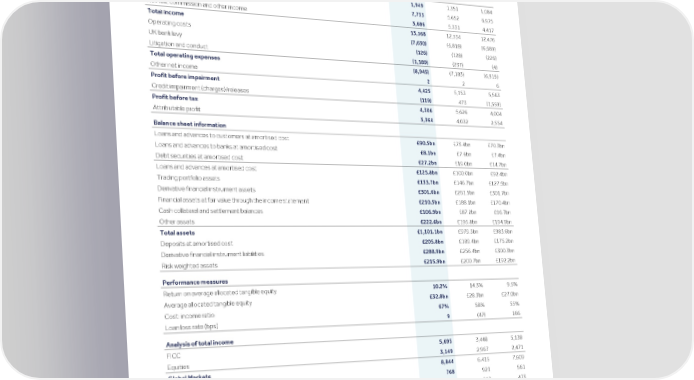 Strategic Shareholder Climate and Risk Financial Financial Barclays PLC 388 report information sustainability report Governance review review statements Annual Report 2022 Analysis of results by business (continued) Analysis of Barclays International a Restated 2022 2021 2020 Corporate and Investment Bank £m £m £m Income statement information Net interest income 1,949 1,351 1,084 Net trading income 7,733 5,652 6,975 Net fee, commission and other income 3,686 5,331 4,417 Total income 13,368 12,334 12,476 Operating costs (7,630) (6,818) (6,689) UK bank levy (126) (128) (226) Litigation and conduct (1,189) (237) (4) Total operating expenses (8,945) (7,183) (6,919) Other net income 2 2 6 Profit before impairment 4,425 5,153 5,563 Credit impairment (charges)/releases (119) 473 (1,559) Profit before tax 4,306 5,626 4,004 Attributable profit 3,364 4,032 2,554 Balance sheet information Loans and advances to customers at amortised cost £90.5bn £73.4bn £70.3bn Loans and advances to banks at amortised cost £8.1bn £7.6bn £7.4bn Debt securities at amortised cost £27.2bn £19.0bn £14.7bn Loans and advances at amortised cost £125.8bn £100.0bn £92.4bn Trading portfolio assets £133.7bn £146.7bn £127.5bn Derivative financial instrument assets £301.6bn £261.5bn £301.7bn Financial assets at fair value through the income statement £210.5bn £188.1bn £170.4bn Cash collateral and settlement balances £106.9bn £87.2bn £96.7bn Other assets £222.6bn £195.8bn £194.9bn Total assets £1,101.1bn £979.3bn £983.6bn Deposits at amortised cost £205.8bn £189.4bn £175.2bn Derivative financial instrument liabilities £288.9bn £256.4bn £300.3bn Risk weighted assets £215.9bn £200.7bn £192.2bn Performance measures Return on average allocated tangible equity 10.2% 14.3% 9.5% Average allocated tangible equity £32.8bn £28.3bn £27.0bn Cost: income ratio 67% 58% 55% Loan loss rate (bps) 9 (47) 166 Analysis of total income FICC 5,695 3,448 5,138 Equities 3,149 2,967 2,471 Global Markets 8,844 6,415 7,609 Advisory 768 921 561 Equity capital markets 166 813 473 Debt capital markets 1,281 1,925 1,697 Investment Banking fees 2,215 3,659 2,731 Corporate lending (231) 588 590 Transaction banking 2,540 1,672 1,546 Corporate 2,309 2,260 2,136 Total income 13,368 12,334 12,476 Note a 2021 financial and capital metrics have been restated to reflect the impact of the Over-issuance of Securities. See impact of Over-issuance of Securities on page 356 and Restatement of financial statements (Note 1a) on page 428 for further details.