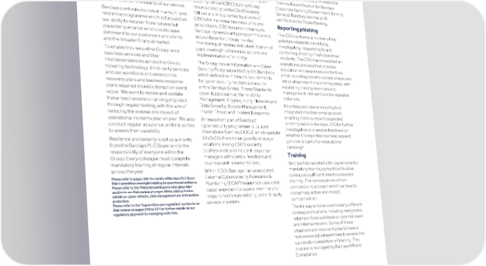 Strategic Shareholder Climate and Risk Financial Financial Barclays PLC 263 report information sustainability report Governance review review statements Annual Report 2022 ESG: Governance (continued) Operational resilience Chief Security Office Certifications Customers and clients have increased The Chief Security Officer for the Group Barclays holds three ISO27001 expectations for us to be ‘Always On’ and heads the Chief Security Office and certifications (being the international the interconnectivity of the financial sector reports directly to the Chief Operating standard on how to manage information means the stability and resilience of our Officer, who sits on the Group Executive security) and successfully renewed the systems, workforce and continued Committee. The Global Chief Information Triennial Recertification for Barclays provision of third-party services all have a Security Officer (CISO) for the Group Corporate Banking (Government Banking direct impact on the quality of our service. reports directly to the Chief Security Service). Barclays also has a UK Officer and is supported by a team of certification for Digital Banking. Barclays continues to invest in a multi-year CISOs for individual business units and resilience programme which is focused on Reporting phishing jurisdictions. CSO leadership manages our ability to recover from ‘severe but The CSO performs a number of key Barclays’ cybersecurity programme and is plausible’ scenarios which could cause activities related to identifying, accountable for the day-to-day detriment to our customers and clients investigating, responding to and monitoring of residual risk, identification of and the broader financial market. containing phishing / malicious email gaps, oversight of remedial actions and To enable this, we define Group-wide incidents. The CSO has embedded an implementation of strategy. business services and their operational process that provides The Group has an Information and Cyber interdependencies across the Group, education and awareness content via Security Policy supported by 10 Standards including technology, third-party services email to colleagues who clicked a malicious which define the minimum requirements and our workforce and develop the link or attachment in a phishing email, with for cyber security matters across the recovery plans and business response escalating training exercises and entire Barclays Group. These Standards plans required should a disruption event management interventions for repeated cover topics such as Vulnerability occur. We work to review and validate instances. Management, Cryptography, Network and these mechanisms on an ongoing basis All colleagues have a reporting tool Data Security, Access Management, through regular testing, with the aim of integrated into their email account, Insider Threat and Incident Response. reducing the volume and impact of enabling them to report suspected operational incidents year on year. We also An important part of Barclays’ phishing mails to Barclays JOC for further conduct regular assurance on third parties cybersecurity programme is its Joint investigation and receive feedback on to assess their capability. Operations Centres (JOCs), which operate whether the reported mail was suspect, 24x7x365 from three globally strategic Resilience and security is set as a priority genuine or part of an educational locations, linking CSO’s security from the Barclays PLC Board and is the campaign. professionals and incident response responsibility of everyone within the Training managers with control functions and Group. Every colleague must complete business unit representatives. Barclays has adopted a 65-day window for mandatory training at regular intervals mandatory training completion to allow across the year. Within CSO, Barclays has a dedicated colleagues sufficient time to complete External Cybersecurity Assurance & Please refer to pages 184 for details of Barclays PLC Board Risk Committee oversight relating to operational resilience. training. The consequence of non- Monitoring (ECAM) team that uses a risk- Please refer to the 'Material existing and emerging risks' completion is a breach which can lead to based approach to assess, monitor and section in our Risk review on pages 269 to 281 for further details on cyber-attacks, data management and information disciplinary action and impact respond to threats relating to third-party protection. compensation. service providers. Please refer to the 'Supervision and regulation' section in our Risk review on pages 370 to 377 for further details on our The 65-day window covers many different regulatory approach to managing such risks. colleague situations, including new joiners, returners from sick leave or parental leave and internal movers. Some of these situations are required by law to have a reasonable adjustment time to enable the successful completion of training. This process is managed by Barclays HR and Compliance.