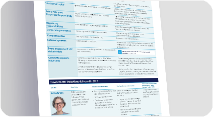 Strategic Shareholder Climate and Risk Financial Financial Barclays PLC 165 report information sustainability report Governance review review statements Annual Report 2022 Directors’ report: Board Nominations Committee report (continued) Training, development and updates for the Board in 2022 Topic Description Areas covered included Updates from key business areas and Group Business areas: Corporate and Investment Bank, Business and function functions, to deepen the Board’s understanding of Consumer Cards and Payments, Barclays UK, US reviews the Group businesses. Consumer Bank. Group functions: Risk, Markets, Legal, HR, Internal Audit, and Compliance. Updates covering areas relevant across the Group. Climate, cyber, Reputation risk, Mindset (including 'Horizontal topics' Culture), data strategy, whistleblowing, complaints, resilience and artificial intelligence. Regular updates on Public Policy and Corporate Reputation Risk matters (for which the Board has direct Public Policy and Responsibility matters. oversight) and a broad range of topics including Corporate Responsibility regulatory engagement and oversight, and climate and sustainability matters. Annual briefing on regulatory responsibilities. Senior Managers Regime and Barclays’ conduct and Regulatory financial crime policies and standards. responsibilities Regular updates on corporate governance. DEI matters, regulatory developments and Corporate governance cybersecurity disclosure obligations. Briefing for Board members (ad hoc). Competition law-related matters. Competition law External input to the Board. Attendance at Board meetings by external speakers and External speakers key regulators, enabling the Board to hear their feedback and observations. Various events enabling the Board to engage directly Board engagement with You can read more about the Board's engagement with with stakeholders. + stakeholders on page 150. stakeholders Committee-specific induction for Julia Wilson, Committee engagement, including sessions with the Committee specific following her appointment as a member of the Board Board Risk Committee Chair, Group Chief Risk Officer, inductions Risk Committee. Interim Group Chief Compliance Officer and Chief Controls Officer. Details of Robert Berry's induction, including in relation to his role as Board Risk Committee Chair, Briefings on Conduct, Reputation and Compliance and can be found in the table below. Legal risk, and various briefings with members of the Risk Executive Committee, as well as the Group Treasurer. New Director inductions delivered in 2022 Handover in accordance with Director Description Induction sessions included Meetings during induction period requirements of Senior Managers Regime (SMR) Tailored Executive • Board governance framework Series of meetings undertaken Formal SMR handover Anna Cross Director induction, and Directors’ duties. during Anna’s induction period, from Tushar Morzaria (as following Anna’s including: outgoing Group Finance • SMR and Conduct rules. appointment as Group Director). • Disclosure requirements • regular one-to-one meetings Finance Director and pursuant to the Market with the Chairman, Group Chief Executive Director. Abuse Regime and the Group Executive, and other members Securities Dealing Code. of the Board • induction meetings with senior executives from across the business. Tailored Non-Executive • The Group’s strategy and Series of meetings with various Formal SMR handover Robert Berry Director induction culture. senior executives from across the from Tim Breedon (as following Robert’s business during Robert's induction outgoing Board Risk • Stakeholder landscape and appointment as a Non- period including from Risk, Committee Chair). relationships. Executive Director, Chair Compliance, Finance, Legal, Internal • Governance matters. and member of the Board Audit, BX and Operations, • Briefings from the Chief Risk Risk Committee and BBUKPLC, Corporate and Officer and Chief Compliance member of the Board Investment Banking, and Consumer Officer (relevant to his Audit Committee. Banking and Payments. responsibilities as Board Risk Committee Chair).