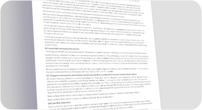 Strategic Shareholder Climate and Risk Financial Financial Barclays PLC 426 report information sustainability report Governance review review statements Annual Report 2022 Notes to the financial statements (continued) For the year ended 31 December 2022 present value of the cash flows or a substantive qualitative amendment – is accounted for as an extinguishment of the original financial liability and the recognition of a new financial liability. Transactions in which the Group transfers assets and liabilities, portions of them, or financial risks associated with them can be complex and it may not be obvious whether substantially all of the risks and rewards have been transferred. It is often necessary to perform a quantitative analysis. Such an analysis compares the Group’s exposure to variability in asset cash flows before the transfer with its retained exposure after the transfer. A cash flow analysis of this nature may require judgement. In particular, it is necessary to estimate the asset’s expected future cash flows as well as potential variability around this expectation. The method of estimating expected future cash flows depends on the nature of the asset, with market and market-implied data used to the greatest extent possible. The potential variability around this expectation is typically determined by stressing underlying parameters to create reasonable alternative upside and downside scenarios. Probabilities are then assigned to each scenario. Stressed parameters may include default rates, loss severity, or prepayment rates. Accounting for reverse repurchase and repurchase agreements including other similar lending and borrowing Reverse repurchase agreements (and stock borrowing or similar transactions) are a form of secured lending whereby the Group provides a loan or cash collateral in exchange for the transfer of collateral, generally in the form of marketable securities subject to an agreement to transfer the securities back at a fixed price in the future. Repurchase agreements are where the Group obtains such loans or cash collateral, in exchange for the transfer of collateral. The Group purchases (a reverse repurchase agreement) or borrows securities subject to a commitment to resell or return them. The securities are not included in the balance sheet as the Group does not acquire the risks and rewards of ownership. Consideration paid (or cash collateral provided) is accounted for as a loan asset at amortised cost, unless it is designated or mandatorily at fair value through profit and loss. The Group may also sell (a repurchase agreement) or lend securities subject to a commitment to repurchase or redeem them. The securities are retained on the balance sheet as the Group retains substantially all the risks and rewards of ownership. Consideration received (or cash collateral provided) is accounted for as a financial liability at amortised cost, unless it is designated at fair value through profit and loss. (iv) Issued debt and equity instruments The Group applies IAS 32, Financial Instruments: Presentation, to determine whether funding is either a financial liability (debt) or equity. Issued financial instruments or their components are classified as liabilities if the contractual arrangement results in the Group having an obligation to either deliver cash or another financial asset, or a variable number of equity shares, to the holder of the instrument. If this is not the case, the instrument is generally an equity instrument and the proceeds included in equity, net of transaction costs. Dividends and other returns to equity holders are recognised when paid or declared by the members at the Annual General Meeting and treated as a deduction from equity. Where issued financial instruments contain both liability and equity components, these are accounted for separately. The fair value of the debt is estimated first and the balance of the proceeds is included within equity. (v) Changes in the basis for determining contractual cash flows resulting from interest rate benchmark reform A change in the basis of determining the contractual cash flows of a financial instrument that is required by interest rate benchmark reform is accounted for by updating the effective interest rate, without the recognition of an immediate gain or loss. This practical expedient is only applied where (1) the change to the contractual cash flows is necessary as a direct consequence of the reform and (2) the new basis for determining the contractual cash flows is economically equivalent to the previous basis. For changes made in addition to those required by the interest rate benchmark reform, the practical expedient is applied first, after which the normal IFRS 9 requirements for modifications of financial instruments is applied. Refer to Note 14 for further details regarding hedge accounting policies in respect of interest rate benchmark reform. Refer to Note 41 for further disclosure related to interest rate benchmark reform. (vi) Cash flow statement Cash comprises cash on hand and balances at central banks. Cash equivalents comprise loans and advances to banks, cash collateral balances with central banks related to payment schemes and treasury and other eligible bills, all with original maturities of three months or less. Repurchase and reverse repurchase agreements are not considered to be part of cash equivalents. Investments in debt securities at amortised cost, presented within loans and advances on the balance sheet, are deemed to be investing activities for the purposes of the cash flow statement, except those instruments considered to be cash equivalents. Debt securities issued and redeemed are considered to be operating activities, except qualifying eligible liabilities that satisfy regulatory requirements for MREL instruments (or have previously satisfied these requirements since 2019 when they came into effect), which are considered to be financing activities. 5. New and amended