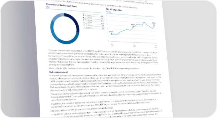 Strategic Shareholder Climate and Risk Financial Financial Barclays PLC 363 report information sustainability report Governance review review statements Annual Report 2022 Risk performance - Treasury and Capital risk (continued) • A decrease in the discount rate corresponds to an increase in liabilities. Pension risk is generated through the Group’s defined benefit schemes and this risk is set to reduce over time as the main defined benefit scheme is closed to new entrants. The chart below outlines the shape of the UKRF’s liability cash flow profile as at 31 December 2022 that takes account of the future inflation indexing of payments to beneficiaries. The majority of the cash flows (approximately 95%) fall between 0 and 40 years, peaking between 11 and 20 years and reducing thereafter. The shape may vary depending on changes to inflation and longevity expectations and any members who elect to transfer out. Transfers out will bring forward the liability cash flows. For more detail on the UKRF’s financial and demographic assumptions, see Note 33 to the financial statements. Proportion of liability cash flows Net IAS 19 position (%) (£bn) 6 0-10 years 28.6 n 11-20 years 31.4 n 4.63bn 5 21-30 years 23.2 n 3.82bn 31-40 years 12.1 n 4 41-50 years 4.3 n 3 51+ years 0.5 n 1.77bn 2 1 0 Dec Dec Dec 2020 2021 2022 The graph above shows the evolution of the UKRF’s net IAS 19 position over the last two years. During 2022 the increase in the IAS 19 pension surplus was primarily driven by scheduled deficit reduction contributions, including payments made to unwind Heron transactions. The significant increase in interest rates over 2022 has had a broadly neutral impact on the net funding position. Benefit obligation reductions due to higher discount rates have been broadly offset by the changes in the fair value of scheme assets. Higher realised inflation over the year had a negative impact by increasing the projected liabilities, which was partially offset by updates to the demographic assumptions. Refer to Note 33 to the financial statements for the sensitivity of the UKRF to changes in key assumptions. Risk measurement In line with Barclays’ risk management framework the assets and liabilities of the UKRF are modelled within a VaR framework to show the volatility of the pension position at a total portfolio level. This enables the risks, diversification and liability matching characteristics of the UKRF obligations and investments to be adequately captured. VaR is measured and monitored on a monthly basis. Risks are reviewed and reported regularly at forums including the Board Risk Committee, the Group Risk Committee and the Pension Executive Board. The VaR model takes into account the valuation of the liabilities on an IAS 19 basis (see Note 33 to the financial statements). The Trustee receives quarterly VaR measures on a funding basis. The pension liability is also sensitive to post-retirement mortality assumptions which are reviewed regularly (See Note 33 to the financial statements). To mitigate part of this risk the UKRF has entered into longevity swaps hedging approximately three quarters of current pensioner liabilities. In addition, the impact of pension risk to the Group is taken into account as part of the stress testing process. Stress testing is performed internally on at least an annual basis. The UKRF exposure is also included as part of regulatory stress tests. Barclays defined benefit pension schemes affects capital in two ways: • An IAS 19 deficit is treated as a liability on the Group’s balance sheet. Movement in a deficit due to remeasurements, including actuarial losses, are recognised immediately through Other Comprehensive Income and as such reduces shareholders’ equity and CET1 capital. An IAS 19 surplus is treated as an asset on the balance sheet and increases shareholders’ equity; however, it is deducted for the purposes of determining CET1 capital. • In the Group’s statutory balance sheet an IAS 19 surplus or deficit is partially offset by a deferred tax liability or asset respectively. These may or may not be recognised for calculating CET1 capital depending on the overall deferred tax position of the Group at the particular time. Pension risk is taken into account in the Pillar 2A capital assessment undertaken by the PRA at least annually. The Pillar 2A requirement forms part of the Group’s Overall Capital Requirement for CET1 capital, Tier 1 capital and total capital. More detail on minimum regulatory requirements can be found in the Overall capital requirements section.