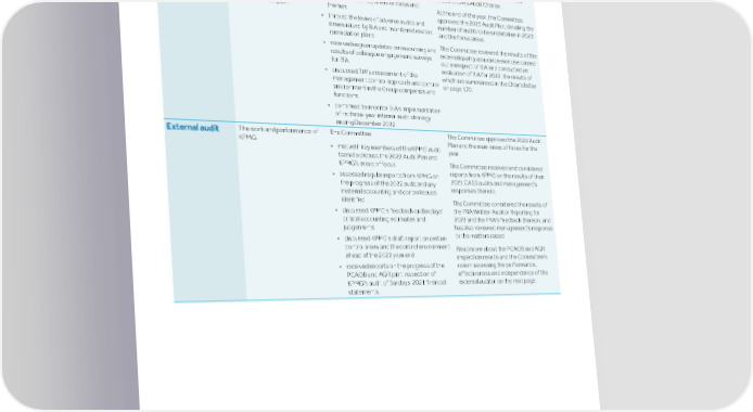 Strategic Shareholder Climate and Risk Financial Financial Barclays PLC 175 report information sustainability report Governance review review statements Annual Report 2022 Directors’ report: Board Audit Committee report (continued) Areas of focus Matters addressed Role of Committee Conclusion/action taken The Committee reviewed BIA's audit The performance of BIA and During the year, the Committee: Internal audit delivery of the internal audit results and performance reports, and • scrutinised and agreed internal audit plans, plan, including scope of work quality assurance reports. The Committee methodology and deliverables for 2022 performed, the level of also reviewed and approved the annual • reviewed BIA's audit reports in relation to resources, and the review of BIA's Audit Charter. specific audits, key areas of focus and methodology and coverage of At the end of the year, the Committee themes the internal audit plan. approved the 2023 Audit Plan, detailing the • tracked the levels of adverse audits and number of audits to be undertaken in 2023 issues raised by BIA and monitored related and the focus areas. remediation plans The Committee reviewed the results of the • received regular updates on resourcing and external quality assurance exercise carried results of colleague engagement surveys out in respect of BIA and conducted an for BIA evaluation of BIA for 2022, the results of • discussed BIA's assessment of the which are summarised in the Chair’s letter management control approach and control on page 170. environment in the Group companies and functions • continued to monitor BIA's implementation of its three-year internal audit strategy ending December 2022. The work and performance of The Committee: The Committee approved the 2022 Audit External audit KPMG. Plan and the main areas of focus for the • met with key members of the KPMG audit year. team to discuss the 2022 Audit Plan and KPMG’s areas of focus The Committee received and considered reports from KPMG on the results of their • assessed regular reports from KPMG on 2021 CASS audits and management's the progress of the 2022 audit and any responses thereto. material accounting and control issues identified The Committee considered the results of • discussed KPMG’s feedback on Barclays’ the PRA Written Auditor Reporting for critical accounting estimates and 2022 and the PRA's feedback thereon, and judgements has also reviewed management's response to the matters raised. • discussed KPMG’s draft report on certain control areas and the control environment Read more about the PCAOB and AQR ahead of the 2022 year end inspection results and the Committee’s • received reports on the progress of the role in assessing the performance, PCAOB and AQR joint inspection of effectiveness and independence of the KPMG's audit of Barclays' 2021 financial external auditor on the next page. statements.