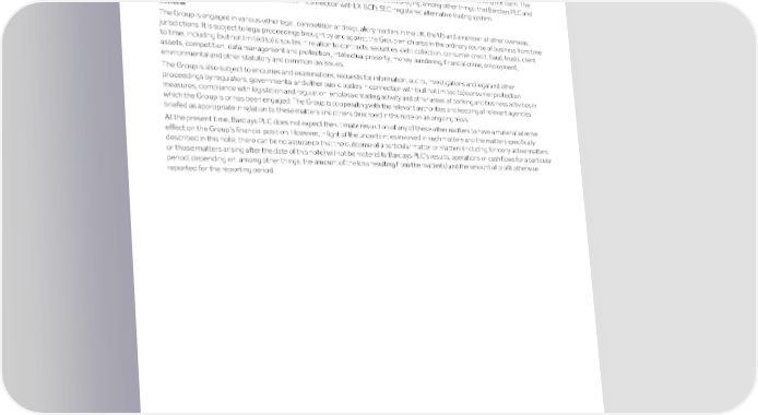 Strategic Shareholder Climate and Risk Financial Financial Barclays PLC 484 report information sustainability report Governance review review statements Annual Report 2022 Notes to the financial statements (continued) Accruals, provisions, contingent liabilities and legal proceedings 3. Barclays PLC Alternative trading systems In 2020, a claim was brought against Barclays PLC in the UK in the High Court by various shareholders regarding Barclays PLC’s share price based on the allegations contained within a complaint by the New York State Attorney General (NYAG) in 2014. Such claim was settled in 2016, as previously disclosed. The more recent claim seeks unquantified damages and Barclays is defending the claim. The NYAG complaint was filed against Barclays PLC and BCI in the NY Supreme Court alleging, among other things, that Barclays PLC and BCI engaged in fraud and deceptive practices in connection with LX, BCI’s SEC-registered alternative trading system. General The Group is engaged in various other legal, competition and regulatory matters in the UK, the US and a number of other overseas jurisdictions. It is subject to legal proceedings brought by and against the Group which arise in the ordinary course of business from time to time, including (but not limited to) disputes in relation to contracts, securities, debt collection, consumer credit, fraud, trusts, client assets, competition, data management and protection, intellectual property, money laundering, financial crime, employment, environmental and other statutory and common law issues. The Group is also subject to enquiries and examinations, requests for information, audits, investigations and legal and other proceedings by regulators, governmental and other public bodies in connection with (but not limited to) consumer protection measures, compliance with legislation and regulation, wholesale trading activity and other areas of banking and business activities in which the Group is or has been engaged. The Group is cooperating with the relevant authorities and keeping all relevant agencies briefed as appropriate in relation to these matters and others described in this note on an ongoing basis. At the present time, Barclays PLC does not expect the ultimate resolution of any of these other matters to have a material adverse effect on the Group’s financial position. However, in light of the uncertainties involved in such matters and the matters specifically described in this note, there can be no assurance that the outcome of a particular matter or matters (including formerly active matters or those matters arising after the date of this note) will not be material to Barclays PLC’s results, operations or cash flows for a particular period, depending on, among other things, the amount of the loss resulting from the matter(s) and the amount of profit otherwise reported for the reporting period.