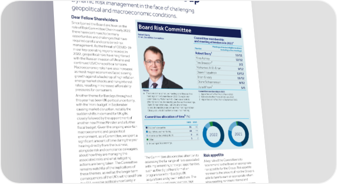 Strategic Shareholder Climate and Risk Financial Financial Barclays PLC 178 report information sustainability report Governance review review statements Annual Report 2022 Directors’ report: Board Risk Committee report Prudent oversight of the risks facing the Group Dynamic Risk management in the face of challenging geopolitical and macroeconomic conditions. Dear Fellow Shareholders Since I joined the Board and took on the Board Risk Committee role of Risk Committee Chair in early 2022, Robert Berry Committee membership there have continued to be many a Chair, Board Risk Committee and meeting attendance in 2022 opportunities and challenges that have Meetings attended/eligible to attend required careful and considered risk Member (including ad hoc meetings) management. As the threat of COVID-19 1 Robert Berry 11/11 in our key operating regions receded in Mike Ashley 12/12 2022, geopolitical risks have heightened 2 Tim Breedon 2/2 with the Russian invasion of Ukraine and continued US/China political tensions. Mohamed A. El-Erian 9/12 Macroeconomic risks have also increased Dawn Fitzpatrick 12/12 as most major economies faced slowing Brian Gilvary 11/12 growth against a backdrop of high inflation, Diane Schueneman 8/12 energy market shocks and rising interest 3 Julia Wilson 5/5 rates, resulting in increased affordability Notes Committee membership in 2022 pressures for consumers. a There were nine scheduled meetings and three ad-hoc 1 Appointed with effect from 1 March 2022. meetings of the Committee in 2022. Owing to prior 2 Retired with effect from 28 February 2022. Another theme for Barclays throughout commitments, Mohamed A. El-Erian was unable to 3 Appointed with effect from 1 September 2022. this year has been UK political uncertainty, attend one scheduled meeting and two ad-hoc meetings, Notes Diane Schueneman was unable to attend three with the ‘mini-budget’ in September scheduled meetings and one ad-hoc meeting and Brian causing market disruption, notably the Gilvary was unable to attend one ad-hoc meeting. sudden shifts in demand for UK gilts, b Committee allocation of time (%) closely followed by the appointment of another new Prime Minister and a further 2022 2021 fiscal budget. Given the ongoing uncertain 36 46 n Risk profile/appetite macroeconomic and geopolitical 50 34 n Key risk issues/monitoring environment, as a Committee, we spent a 9 18 n Internal controls/risk policies 5 2 n Other significant amount of time during the year b Including ad hoc meetings. hearing directly from the business, alongside risk and compliance colleagues, about how they are managing the associated risks and what mitigating The Committee also devoted attention to Risk appetite actions are being taken. The Committee assessing the full range of risks associated A key role of the Committee is to remains watchful of the implications of with implementing strategic opportunities, recommend to the Board an appropriate these themes, as well as the longer term such as the digital transformation risk appetite for the Group. Risk appetite consequences of the UK’s withdrawal from programme within Barclays UK, represents the amount of risk the Group is the EU, possible political uncertainty in acquisitions and growth initiatives. The able to take to earn an appropriate return other key jurisdictions and the potential for Committee continues to encourage while meeting minimum internal and disorderly market corrections and management to be alert to areas of regulatory capital requirements in a severe economic slowdowns across the globe. emerging risk, particularly in light of the but plausible stress environment. The rapidly evolving macroeconomic and In addition to the geopolitical and Committee analyses Barclays’ geopolitical climate. macroeconomic climate, the Committee performance in both its internally has continued to focus on the Set out below are some of the key areas of generated stress tests and those management of the Group’s non-financial the Committee's work in 2022, but you can developed externally by such bodies as the risks, including operational risks, such as read more about how the Committee Bank of England (BoE) and the FRB in the cyber-related vulnerabilities, conduct risks, discharged its duties in the table on pages US and, following such analysis, may including those related to the facilitation of 182 to 185. recommend adjustments to the Group’s financial crime, and the work undertaken to overall risk profile. mitigate the risks associated with the Over-issuance of Securities.