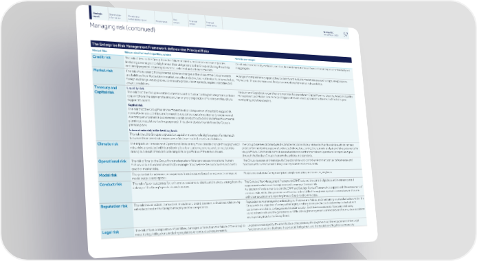 Strategic Shareholder Climate and Risk Financial Financial Barclays PLC 57 report information sustainability report Governance review review statements Annual Report 2022 Managing risk (continued) The Enterprise Risk Management Framework defines nine Principal Risks Principal Risks Risks are classified into Principal Risks, as below How risks are managed The risk of loss to the Group from the failure of clients, customers or counterparties Credit risk teams identify, evaluate, sanction, limit and monitor various forms of credit exposure, individually and Credit risk (including sovereigns), to fully honour their obligations to the Group, including the whole in aggregate. and timely payment of principal, interest, collateral and other receivables. The risk of loss arising from potential adverse changes in the value of the Group’s assets A range of complementary approaches to identify and evaluate Market risk are used to capture exposure to Market risk and liabilities from fluctuation in market variables including, but not limited to, interest rates, Market risk. These are measured, limited and monitored by market risk specialists. foreign exchange, equity prices, commodity prices, credit spreads, implied volatilities and asset correlations. Liquidity risk Treasury and Capital risk is identified and managed by specialists in Capital Planning, Liquidity, Asset and Liability Treasury and Management and Market Risk. A range of approaches are used appropriate to the risk, such as limits; plan The risk that the Group is unable to meet its contractual or contingent obligations or that it Capital risk monitoring; and stress testing. does not have the appropriate amount, tenor and composition of funding and liquidity to support its assets. Capital risk The risk that the Group has an insufficient level or composition of capital to support its normal business activities and to meet its regulatory capital requirements under normal operating environments and stressed conditions (both actual and as defined for internal planning or regulatory testing purposes). This also includes the risk from the Group’s pension plans. Interest rate risk in the banking book The risk that the Group is exposed to capital or income volatility because of a mismatch between the interest rate exposures of its (non-traded) assets and liabilities. The impact on Financial and Operational Risks arising from climate change through physical The Group assesses and manages its Climate risk across its businesses and functions in line with its net zero Climate risk risks, risks associated with transitioning to a low-carbon economy and connected risks ambition by monitoring exposure to elevated risk sectors, conducting scenario analysis and risk assessments for arising as a result of second order impacts on portfolios of these two drivers. key portfolios. Climate risk controls are embedded across the financial and Operational Principal Risk types through the Barclays Group's frameworks, policies and standards. The risk of loss to the Group from inadequate or failed processes or systems, human The Group assesses and manages its Operational risk and control environment across its businesses and Operational risk factors or due to external events (for example, fraud) where the root cause is not due to functions with a view to maintaining an acceptable level of residual risk. credit or market risks. The potential for adverse consequences from decisions based on incorrect or misused Models are evaluated for approval prior to implementation, and on an ongoing basis. Model risk model outputs and reports. The risk of poor outcomes for, or harm to, customers, clients and markets, arising from the The Conduct Risk Management Framework (CRMF) sets out the control objectives and minimum control Conduct risk delivery of the Group's products and services. requirements which must be implemented to manage Conduct risk. A selection of tools is mandated in the CRMF and Barclays Control Framework to support with the assessment of conduct risks, whilst the governance of Conduct risk is fulfilled through management committees and forums with clear escalation and reporting lines to Board-level committees. The risk that an action, transaction, investment, event, decision, or business relationship Reputation risk is managed by embedding our Purpose and Values, and maintaining a controlled culture within the Reputation risk will reduce trust in the Group’s integrity and/or competence. Group, with the objective of acting with integrity, enabling strong and trusted relationships to be built with customers and clients, colleagues and broader society. Each business assesses Reputation risk using standardised tools and the governance is fulfilled through management committees and forums, clear escalation and reporting lines to the Group Board. The risk of loss or imposition of penalties, damages or fines from the failure of the Group to Legal risk is managed by the identification of legal risks by the Legal function, the engagement of the Legal Legal risk meet its legal obligations, including regulatory or contractual requirements. function in situations that have the potential for legal risk, and the escalation of legal risk as necessary.
