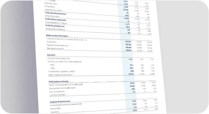 Strategic Shareholder Climate and Risk Financial Financial Barclays PLC 389 report information sustainability report Governance review review statements Annual Report 2022 Analysis of results by business (continued) Analysis of Barclays International continued 2022 2021 2020 Consumer, Cards and Payments £m £m £m Income statement information Net interest income 2,979 1,912 2,198 Net fee, commission, trading and other income 1,520 1,419 1,247 Total income 4,499 3,331 3,445 Operating costs (2,731) (2,258) (2,076) UK bank levy (7) (6) (14) Litigation and conduct (314) (108) (44) Total operating expenses (3,052) (2,372) (2,134) Other net income 26 38 22 Profit before impairment 1,473 997 1,333 Credit impairment charges (814) (185) (1,721) Profit/(loss) before tax 659 812 (388) Attributable profit/(loss) 480 615 (334) Balance sheet information Loans and advances to customers at amortised cost £43.2bn £33.0bn £29.7bn Total assets £80.2bn £64.8bn £58.2bn Deposits at amortised cost £81.8bn £69.4bn £65.3bn Risk weighted assets £38.9bn £30.2bn £30.1bn Key facts US cards 30 day arrears rate 2.2% 1.6% 2.5% US cards customer FICO score distribution 660 89% 90% 87% Total number of payments clients 395k 380k 365k a Value of payments processed £307bn £277bn £274bn Performance measures Return on average allocated tangible equity 10.0% 15.0% (7.5%) Average allocated tangible equity £4.8bn £4.1bn £4.5bn Cost: income ratio 68% 71% 62% Loan loss rate (bps) 175 51 517 Analysis of total income International Cards and Consumer Bank 2,913 2,092 2,433 Private Bank 1,014 781 707 Payments 572 458 305 Total income 4,499 3,331 3,445 Note a Includes £296bn (2021: £270bn; 2020: £268bn) of merchant acquiring payments.
