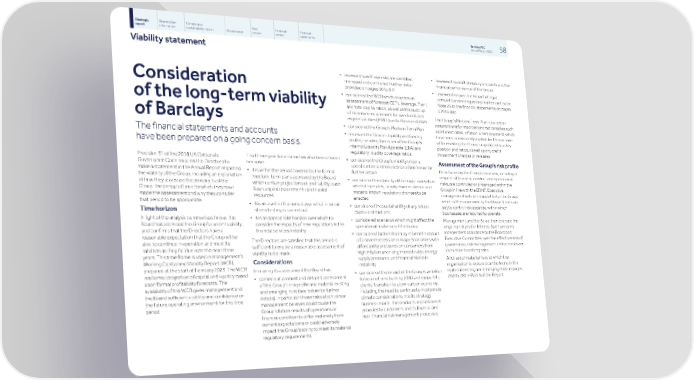 Strategic Shareholder Climate and Risk Financial Financial Barclays PLC 58 report information sustainability report Governance review review statements Annual Report 2022 Viability statement ▪ reviewed how those risks are identified, ▪ reviewed the draft statutory accounts and the managed and controlled (further detail financial performance of the Group provided on pages 56 to 57) Consideration ▪ reviewed the possible impact of legal, ▪ considered the WCR which provides an competition and regulatory matters set out in assessment of forecast CET1, leverage, Tier 1 Note 26 to the financial statements on pages of the long-term viability and total capital ratios, as well as the build-up 479 to 484. of minimum requirement for own funds and The Group's Medium Term Plan is based on eligible liabilities (MREL) up to the end of 2025 of Barclays assumptions for macroeconomic variables such ▪ considered the Group’s Medium Term Plan as interest rates, inflation, unemployment, which ▪ reviewed the Group’s liquidity and funding have been consistently applied for the purpose The financial statements and accounts profile, including forecasts of the Group’s of forecasting the Group’s capital and liquidity have been prepared on a going concern basis. internal Liquidity Risk Appetite (LRA) and position and ratios, as well as any credit regulatory liquidity coverage ratios impairment charges or releases. The three-year time frame has also been chosen Provision 31 of the 2018 UK Corporate ▪ considered the Group’s viability under a Assessment of the Group's risk profile because: Governance Code requires the Directors to specific internal stress scenario (see below for Risks faced by the Group’s business, including in make a statement in the Annual Report regarding ▪ it is within the period covered by the formal further detail) respect of financial, conduct and operational the viability of the Group, including an explanation medium-term plans approved by the Board ▪ considered the stability of the major markets in risks, are controlled and managed within the of how they assessed the prospects of the which contain projections of profitability, cash which it operates, supply chain resilience and Group in line with the ERMF. Executive Group, the period of time for which they have flows, capital requirements and capital material known regulatory changes to be management sets a risk appetite for the Group, made the assessment and why they consider resources enacted which is then approved by the Board. Limits are that period to be appropriate. ▪ it is also within the period over which internal ▪ considered the sustainability of any future set to control risk appetite, within which Time horizon stress testing is carried out capital distributions businesses are required to operate. In light of the analysis summarised below, the ▪ it is an appropriate horizon over which to ▪ considered scenarios which might affect the Management and the Board then oversee the Board has assessed the Group’s current viability, consider the impacts of new regulations in the operational resilience of the Group ongoing risk profile. Internal Audit provides and confirms that the Directors have a financial services industry. independent assurance to the Board and ▪ considered factors that may inform the impact reasonable expectation that the Group will be Executive Committee over the effectiveness of The Directors are satisfied that this period is of a severe recession in major economies with able to continue in operation and meet its governance, risk management and control over sufficient to enable a reasonable assessment of affordability pressures on consumers from liabilities as they fall due over the next three current and evolving risks. viability to be made. high inflation and rising interest rates, energy years. This time frame is used in management’s supply pressures, and financial markets A full set of material risks to which the Working Capital and Viability Report (WCR), Considerations instability organisation is exposed can be found in the prepared at the start of February 2023. The WCR In making its assessment the Board has: material existing and emerging risks on pages ▪ considered the impact of the Group’s ambition is a formal projection of capital and liquidity based ▪ carried out a robust and detailed assessment 269 to 281 in Part 3 of the Report. to be a net zero bank by 2050 and support its upon formal profitability forecasts. The of the Group’s risk profile and material existing clients’ transition to a low-carbon economy, availability of the WCR gives management and and emerging risks (see below for further including the need to continue to incorporate the Board sufficient visibility and confidence on details), in particular those risks which senior climate considerations into its strategy, the future operating environment for this time management believes could cause the business model, the products and services it period. Group’s future results of operations or provides to customers and its financial and financial condition to differ materially from non-financial risk management processes current expectations or could adversely impact the Group’s ability to meet its material regulatory requirements