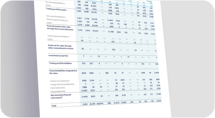 Strategic Shareholder Climate and Risk Financial Financial Barclays PLC 460 report information sustainability report Governance review review statements Annual Report 2022 Notes to the financial statements (continued) Assets and liabilities held at fair value Analysis of movements in Level 3 assets and liabilities Total gains and (losses) in the period recognised in the Total gains income statement Transfers As at 1 or (losses) As at 31 January Trading Other recognised December b 2022 Purchases Sales Issues Settlements income income in OCI In Out 2022 £m £m £m £m £m £m £m £m £m £m £m Corporate debt 389 394 (182) — (18) (39) — — 87 (34) 597 Non asset backed loans 758 7,009 (2,635) — (19) (264) — — 10 (22) 4,837 Other 1,134 665 (412) — (298) (43) — — 275 (275) 1,046 Trading portfolio assets 2,281 8,068 (3,229) — (335) (346) — — 372 (331) 6,480 Non asset backed loans 5,647 2,739 (1,019) — (1,487) (733) — — 49 (84) 5,112 Private equity investments 1,095 192 (64) — (24) 95 (66) — 56 — 1,284 Other 2,970 6,482 (6,540) — (189) 4 3 — 17 (18) 2,729 Financial assets at fair value through the income statement 9,712 9,413 (7,623) — (1,700) (634) (63) — 122 (102) 9,125 Private equity investments — — — — — — — 1 6 — 7 Other 38 — — — (32) — — (2) — — 4 Assets at fair value through other comprehensive income 38 — — — (32) — — (1) 6 — 11 Investment properties 7 — (1) — — — (1) — — — 5 Trading portfolio liabilities (27) (23) 8 — — 9 — — (27) 4 (56) Financial liabilities designated at fair value (410) (286) — (98) 82 70 — — (448) 40 (1,050) Interest rate derivatives (260) (216) — — 54 (467) — — 431 (38) (496) Foreign exchange derivatives 2 — — — (6) 27 — — — 16 39 Credit derivatives (386) (4) (2) — 57 23 — — 11 (12) (313) Equity derivatives (1,405) (213) — — 333 306 — — (11) 571 (419) Net derivative financial a instruments (2,049) (433) (2) — 438 (111) — — 431 537 (1,189) Total 9,552 16,739 (10,847) (98) (1,547) (1,012) (64) (1) 456 148 13,326