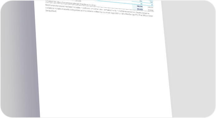 Strategic Shareholder Climate and Risk Financial Financial Barclays PLC 510 report information sustainability report Governance review review statements Annual Report 2022 Notes to the financial statements (continued) Scope of consolidation Collateral held as security for assets Under certain transactions, including reverse repurchase agreements and stock borrowing transactions, the Group is allowed to resell or re-pledge the collateral held. The fair value at the balance sheet date of collateral accepted and re-pledged or transferred to others was as follows: 2022 2021 £m £m Fair value of securities accepted as collateral 988,340 928,999 Of which fair value of securities re-pledged/transferred to others 892,026 814,448 Additional disclosure has been included in collateral and other credit enhancements in the Risk review section. Assets pledged as collateral include all assets categorised as encumbered in the disclosure on pages 180 to 182 of the Barclays PLC Pillar 3 Report 2022 (unaudited).