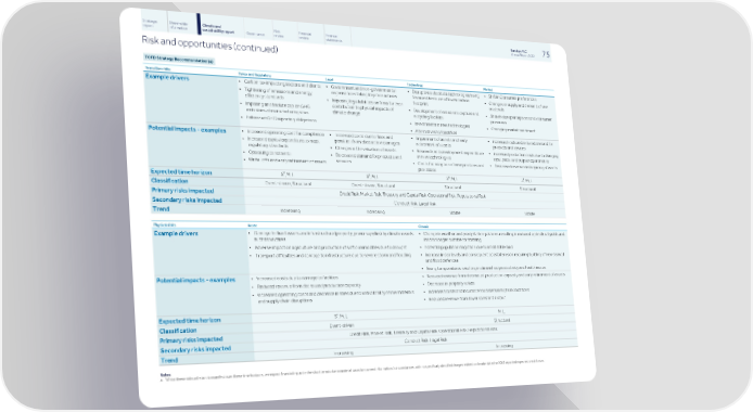 Strategic Shareholder Climate and Risk Financial Financial Barclays PLC 75 report information sustainability report Governance review review statements Annual Report 2022 Risk and opportunities (continued) TCFD Strategy Recommendation (a) Transition risks Policy and Regulatory Legal Technology Market • Carbon tax impacting sectors and clients • Government and non-governmental • Disruptive substitute technologies being • Shift in Consumer preferences Example drivers organisations taking litigation actions favoured because of lower carbon • Tightening of emissions and energy • Changes in supply and demand of raw footprint efficiency standards • Imposing legal liabilities on firms for their materials contribution to physical impacts of • Development of emissions capture and • Imposing an absolute cap on GHG • Shareholder perceptions and consumer climate change recycling facilities emissions at manufacturing sites pressures • Investments in new technologies • Enhanced GHG reporting obligations • Changing market sentiment • Alternatives to fossil fuel • Increased operating cost for compliance • Increased costs due to fines and • Impairment of assets and early • Increased costs and reduced demand for Potential impacts - examples penalties from class action damages retirement of assets products and services • Increased capital expenditure to meet regulatory standards • Changes in the valuation of assets • Research and development expenditure • Increased production costs due to changing in new technologies input prices and output requirements • Operating constraints • Decreased demand for products and services • Costs for adoption of new practices and • Decreased revenue and repricing of assets • Write-offs and early retirement of assets processes a a a a S , M, L S , M, L S , M, L S , M, L Expected time horizon Event-driven, Structural Event-driven, Structural Structural Structural Classification Credit Risk, Market Risk, Treasury and Capital Risk, Operational Risk, Reputational Risk Primary risks impacted Conduct Risk, Legal Risk Secondary risks impacted Increasing Increasing Stable Stable Trend Physical risks Acute Chronic • Damage to fixed assets and infrastructure (property, power supplies) by climate events • Change in weather and precipitation patterns resulting in reduced agricultural yields and Example drivers such as wildfires land no longer suitable for farming • Adverse impact on agriculture and production of soft commodities due to drought • Potential population migration due to inhabitable land • Transport difficulties and damage to infrastructure due to severe storm and flooding • Increase in sea levels and consequent coastal erosion requiring building of new seawall and flood defences • Rising temperatures resulting in diminished productivity and health issues • Increased costs due to damage to facilities • Reduced revenue from decreased production capacity and early retirement of assets Potential impacts - examples • Reduced revenue from decreased production capacity • Decrease in property values • Increased operating costs and decrease in sales due to unavailability of raw materials • Increased costs and insurance for assets in high risk locations and supply chain disruptions • Reduced revenue from lower sales and output a S , M, L M, L Expected time horizon Event-driven Structural Classification Credit Risk, Market Risk, Treasury and Capital Risk, Operational Risk, Reputational Risk Primary risks impacted Conduct Risk, Legal Risk Secondary risks impacted Increasing Increasing Trend Notes: a Whilst these risks will start to manifest over these time horizons, we expect financial impact in the short term to be immaterial based on current information / circumstances, with no specifically identified charges related to climate risk in the 2022 reported expected credit losses.