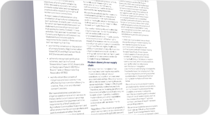 Strategic Shareholder Climate and Risk Financial Financial Barclays PLC 255 report information sustainability report Governance review review statements Annual Report 2022 ESG: Governance (continued) ensure we are respecting human rights in Further details on Barclays Supplier Control Deforestation and agricultural + Obligations can be found at: home.barclays/who-we- our own operations through our commodities are/our-suppliers/our-requirements-of-external- employment policies, in our screening and suppliers/external-supplier-control-obligations/ Barclays recognises that deforestation is a engagement within our supply chain and The TPCoC makes specific reference to key driver of climate change and through the responsible provision of our the International Labour Orgnization (ILO) biodiversity loss and is frequently linked products and services. Core Conventions and the UK Modern with significant adverse human rights We have continued to progress our efforts Slavery Act 2015 and is owned by Barclays’ impacts. We are a signatory to the New to identify salient human rights risks Chief Procurement Officer. It outlines the York Declaration on Forests and its associated with our client financing behaviours we encourage in our supply objectives of ending deforestation by portfolio and on our plan to review our chain and seeks to align the practices of 2030. We seek to support clients that approach to managing these risks. our suppliers with our own policies. This promote sustainable land management includes on issues such as freely chosen We seek to proactively monitor issues and practices while respecting the rights of employment (work that is completed developments globally that may present workers and local communities. voluntarily and without slavery, servitude, new or elevated human rights risks and A major cause of deforestation is the forced or compulsory labour and human work to investigate our potential exposure production of agricultural commodities trafficking) and practices, the absence of to these and consider our responsibilities such as timber products, palm oil and soy, which could lead to exploitation in any to seek to mitigate these risks. for which we have established a position complex global supply chain, such as lack Our position statements and related due statement and due diligence approach of access to an independent diligence approach for clients operating in that applies to clients involved in these whistleblowing process and grievance certain sectors with elevated activities. Our approach is outlined in our mechanism. environmental and social impacts, seek to Forestry and Agricultural Commodities In 2022, we incorporated new contract include consideration of human rights Statement and includes specific clauses focusing on modern slavery into impacts. For example, we include specific requirements for clients in these sectors, our standard supplier terms and due diligence questions around respect for such as requiring that they: conditions, which will apply to new Indigenous Peoples’ rights, health and • prohibit the conversion or degradation contracts and contract renewals moving safety and provision of security in our due of primary forests, High Conservation forward. Specifically, these clauses diligence questionnaires for clients in Value (HCV) and High Carbon Stock prohibit suppliers from using forced, energy sub-sectors such as fracking and (HCS) areas and peatlands bonded or involuntary prison labour, oil sands which are covered under our human trafficking, child labour or modern Climate Change Statement. • adhere to recognised certification slavery practices, which include practices schemes, such as the Forest Modern slavery in our supply such as the retention of personal Stewardship Council (FSC), Roundtable chain identification or immigration on Sustainable Palm Oil (RSPO) or documentation and denying individuals the We recognise that the nature of our Round Table on Responsible Soy freedom to leave their employment. Our business means we may be exposed to Association (RTRS) contract negotiators are being supported modern slavery risks across our by a dedicated in-house expert advisor operations, supply chain, and customer • work to obtain the consent of during implementation of these new and client relationships. We are conscious indigenous and local communities terms. of the links between human rights abuse, affected by their operations through a labour exploitation, human trafficking and credible, 'free, prior and informed We continue to include modern slavery environmentally destructive practices. consent' process. and sustainability-related considerations Therefore, we are focusing our efforts on during the sourcing processes for key We have established a detailed due the delivery of actions specifically designed products or services in categories diligence questionnaire which we require to seek to identify and try to address identified as presenting with an elevated these clients to complete on an annual modern slavery and other exploitative inherent risk of modern slavery, such as basis to assess their alignment with the practices in our supply chain, in the renewal of our major IT services requirements of the Forestry and collaboration with our environmental contract, purchase of large IT hardware Agricultural Commodities Statement and experts. and printing solutions. other environmental and social criteria and Regardless of the industry or geography in We aim to work with the service providers seek to evaluate whether they are which our suppliers operate, we require of that make up 70% of our Addressable appropriately managing their material b them to comply with applicable laws and Spend to encourage them to have a environmental and social impacts. We regulations. Barclays' standard approach Modern Slavery policy or standard in place intend to update the Forestry and to new supplier onboarding and renewal by 2025. We continue to track our A