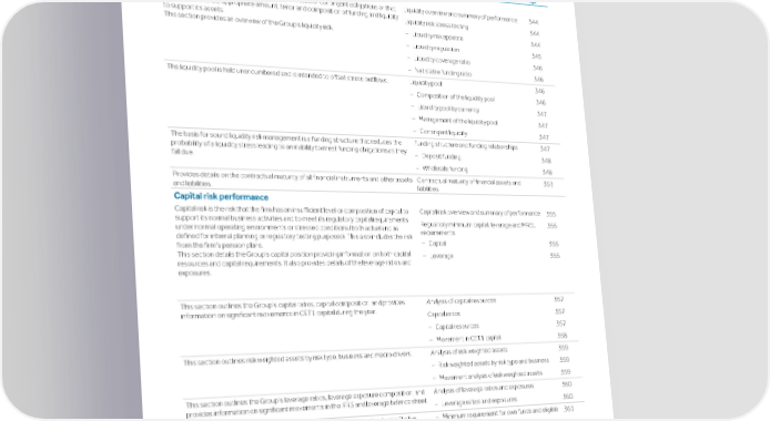 Strategic Shareholder Climate and Risk Financial Financial Barclays PLC 343 report information sustainability report Governance review review statements Annual Report 2022 Risk performance - Treasury and Capital risk Treasury and Capital risk Treasury and Capital risk: summary of contents Page Liquidity risk performance The risk that the firm is unable to meet its contractual or contingent obligations or that Liquidity overview and summary of performance 344 it does not have the appropriate amount, tenor and composition of funding and liquidity Liquidity risk stress testing 344 to support its assets. – Liquidity risk appetite This section provides an overview of the Group’s liquidity risk. 344 – Liquidity regulation 345 – Liquidity coverage ratio 346 – Net stable funding ratio 346 The liquidity pool is held unencumbered and is intended to offset stress outflows. Liquidity pool 346 – Composition of the liquidity pool 346 – Liquidity pool by currency 347 – Management of the liquidity pool 347 – Contingent liquidity 347 The basis for sound liquidity risk management is a funding structure that reduces the Funding structure and funding relationships 347 probability of a liquidity stress leading to an inability to meet funding obligations as they – Deposit funding 348 fall due. – Wholesale funding 348 Provides details on the contractual maturity of all financial instruments and other assets Contractual maturity of financial assets and 351 and liabilities. liabilities Capital risk performance Capital risk is the risk that the firm has an insufficient level or composition of capital to Capital risk overview and summary of performance 355 support its normal business activities and to meet its regulatory capital requirements Regulatory minimum capital, leverage and MREL 355 under normal operating environments or stressed conditions (both actual and as requirements defined for internal planning or regulatory testing purposes). This also includes the risk – Capital 355 from the firm’s pension plans. This section details the Group’s capital position providing information on both capital – Leverage 355 resources and capital requirements. It also provides details of the leverage ratios and exposures. This section outlines the Group’s capital ratios, capital composition, and provides Analysis of capital resources 357 information on significant movements in CET1 capital during the year. Capital ratios 357 – Capital resources 357 – Movement in CET1 capital 358 This section outlines risk weighted assets by risk type, business and macro drivers. Analysis of risk weighted assets 359 – Risk weighted assets by risk type and business 359 – Movement analysis of risk weighted assets 359 This section outlines the Group’s leverage ratios, leverage exposure composition, and Analysis of leverage ratios and exposures 360 provides information on significant movements in the IFRS and leverage balance sheet. – Leverage ratios and exposures 360 This section outlines the Group’s Minimum requirement for own funds and Eligible – Minimum requirement for own funds and eligible 361 Liabilities (MREL) position and ratios. liabilities The Group discloses the two sources of foreign exchange risk that it is exposed to. Foreign exchange risk 362 – Transactional foreign currency exposure 362 – Translational foreign exchange exposure 362 – Functional currency of operations 362 A review focusing on the UK retirement fund, which represents the majority of the Pension risk review 362 Group’s total retirement benefit obligation. 362 – Assets and liabilities 363 – IAS 19 position – Risk measurement 363