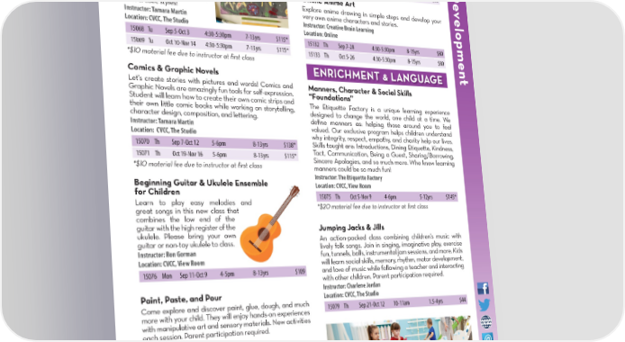 Online Intro to Cartoon Drawing Y tsHALLOWEEN SNAP & TREATFall Crafts Faire & BoutiqueART & MUSIC Students explore the art of cartoon drawing and create outh D Join us at Halloween Snap & Treat for a family friendly Don’t miss out on one-of-a-kind 昀椀nds and treasures! Vendors Art & Creativity Workshop their very own cartoon characters and cartoon strips. enexperience on the trail! Visit spooktacular trick or treat will be selling a variety of beautifully handcrafted and unique Instructor: Creative Brain Learning vstations, take part in a variety of themed photo opportunities items. This is a great opportunity to buy home décor, jewelry, While experimenting with Location: Online featuring fairytale characters, and pick up a Halloween gifts, and other homemade items. Get a head start on your di昀昀erent techniques and holiday shopping or treat yourself! Admission is free. media in every project (oil 15134 Th Sep 7-28 3:30-4:30pm 8-15yrs $80 themed craft. pastels, acrylic painting, Entrance Wristband: $5 per person Location: Crown Valley Community Center colored pencils, watercolor, 15135 Th Oct 5-26 3:30-4:30pm 8-15yrs $80 e Sa Oct 7 9am-2pm All ages Free collage…), children will Online Anime Art v Wristbands will be available for purchase beginning Friday, discover and develop their Explore anime drawing in simple steps and develop your elopmen September 8th at Crown Valley Community Center, Monday own artistic styles! very own anime characters and stories. through Friday from 8:00am to 5:00pm. You may also Instructor: Tamara Martin Instructor: Creative Brain Learning Special Epurchase wristbands on event days. You must present a Location: CVCC, The Studio Location: Online wristband to enter the trail. Everyone walking the trail three 15068 Tu Sep 5-Oct 3 4:30-5:30pm 7-13yrs $115* 15132 Th Sep 7-28 4:30-5:30pm 8-15yrs $80 years and older must purchase a wristband to enter. 15069 Tu Oct 10-Nov 14 4:30-5:30pm 7-13yrs $115* Pumpkin Add On: Decorate a pumpkin to take home for 15133 Th Oct 5-26 4:30-5:30pm 8-15yrs $80 an additional $5 per person. Must purchase with entrance *$10 material fee due to instructor at 昀椀rst class wristband. While supplies last.Comics & Graphic Novels ENRICHMENT & LANGUAGE t Location: Crown Valley Park, 29751 Crown Valley Parkway, Laguna Niguel, Let's create stories with pictures and words! Comics and Manners, Character & Social Skills Ca 92677 Labyrinth Walk at Niguel Botanical PreserveGraphic Novels are amazingly fun tools for self-expression. “Foundations” Oct 7 Sat 11:00am-2:00pm Crown Valley Park $5Student will learn how to create their own comic strips and The Etiquette Factory is a unique learning experience Oct 8 Sun 11:00am-2:00pm Crown Valley Park $5Learn about the history, symbolism and power of labyrinths their own little comic books while working on storytelling, designed to change the world, one child at a time. We and walk the labyrinth path at the top of the Niguel Botanical character design, composition, and lettering. de昀椀ne manners as: helping those around you to feel 20th AnnualPreserve. Take in the beautiful view as you experience the Instructor: Tamara Martin valued. Our exclusive program helps children understand peace and tranquility of the labyrinth. Meet at the Crown Location: CVCC, The Studio why integrity, respect, empathy, and charity help our lives. Valley Park amphitheater for an introductory presentation and 15070 Th Sep 7-Oct 12 5-6pm 8-13yrs $138* Skills taught are: Introductions, Dining Etiquette, Kindness, HAUNTED TRAILSthen walk up to the labyrinth as a group. (Please note that the 15071 Th Oct 19-Nov 16 5-6pm 8-13yrs $115* Tact, Communication, Being a Guest, Sharing/Borrowing, Haunted Trails is back again for another unnerving, dreadful pathway from the amphitheater to the labyrinth is steep.) *$10 material fee due to instructor at 昀椀rst class Sincere Apologies, and so much more. Who knew learning year! Join us on the trail for four memorable nights that are Instructor: Charlotte L. Cressey / Location: CVP manners could be so much fun! sure to haunt your dreams. Not recommended for children Instructor: The Etiquette Factory under 11 years old. Sa Oct 21 2-3:30pm All Ages-Children Welcome FREE Beginning Guitar & Ukulele Ensemble Location: CVCC, View Room for Children 15075 Th Oct 5-Nov 9 4-6pm 5-12yrs $145* One-Time Only Entrance Ticket: $13 per person pre-sale; Veterans’ Day Celebration Learn to play easy melodies and *$20 material fee due to instructor at 昀椀rst class $15 day of great songs in this new class that Ghoulish Group Rate: Groups of 10+ can purchase tickets Join us for a Veterans Day Celebration honoring all those combines the low end of the at $10 per person.who have served to protect our liberty and defend our guitar with the high register of the Jumping Jacks & Jills Tickets are available for purchase at Crown Valley freedom. Tribute to include Color Guard, Guest Speaker, ukulele. Please bring your own An action-packed class combining children's music with Community Center, Monday through Friday from 8:00 am acknowledgement of Veterans and light refreshments following guitar or non-toy ukulele to class. lively folk songs. Join in singing, imaginative play, exercise to 5:00pm. You may also purchase tickets on event nights. the ceremony. Instructor: Ron Gorman fun, tunnels, balls, instrumental jam sessions, and more. Kids You must present a physical ticket to enter the trail. Location: CVCC, View Room will learn social skills, memory, rhythm, motor development, Location: Crown Valley Park, 29751 Crown Valley Parkway, Laguna Event will take place on Saturday, November 11th at 11:00am- 15076 Mon Sep 11-Oct 9 4-5pm 8-13yrs $109and love of music while following a teacher and interacting Niguel, Ca 92677 12:30pm at Sea Country Senior and Community Center. Doors with other children. Parent participation required. open at 10:30am Paint, Paste, and Pour Instructor: Charlene Jordan Oct 12 Th 6:
