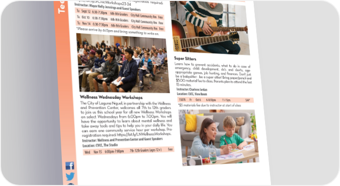 TEEN PROGRAMS Beginning Guitar & Ukulele Ensemble for Teens Haunted Skate Contest Sk & Adults Laguna Niguel Skate Park Jr. Civic Workshops Join the fun of making music on the world's easiest string 27745 Alicia Parkway, Laguna Niguel, CA 92677 Celebrate Halloween with the Laguna Niguel’s Skate Park! This at ams instruments. Must bring your own guitar or ukulele to class. year’s Haunted Skate Contest will take place Saturday, October Join us for Jr. Civic Workshops this Fall! Learn about your Instructor: Ron Gorman (949) 916-7755 • (949) 916-7766 22. Skaters will enjoy best trick contests on various obstacles in e P local government, including how your City operates and Location: CVCC, View Room lnskatepark@cityo昀氀agunaniguel.org the skate park, costume contest, give-a-ways, games, and food ogr collaborates with other agencies to provide the community lnsk8park will be available for purchase from a local food truck. There will with essential services. Community service hours will be 15077 Mo Sep 11-Oct 9 5-6pm 14+yrs $109 Hours of Operation: be so many opportunities to win amazing prizes! ark awarded each month. The workshops are on the 2nd Tuesday of each month from 6:30pm - 7:30pm in the School Days: 12-9:30pm Location: LNSP Community Room at City Hall. Pre-registration required: Weekends, Holidays, and Saturday, October 21 5pm – 9pm https://bit.ly/JrCivicWorkshops23-24 CUSD School Vacations: 9am-9:30pm $15 for passholders/$20 for non-passholders een Pr Instructor: Mayor Kelly Jennings and Guest Speakers Tu Sept 12 6:30-7:30pm 6th-8th Graders City Hall Community Rm Free Residents: $40 annual pass* SKATE CAMPS T Tu Oct 10 6:30-7:30pm 6th-8th Graders City Hall Community Rm Free *Requires proof of residency Non-Residents: $80 annual pass Basics of Skateboarding is a hands-on camp designed to Tu Nov 14 6:30-7:30pm 6th-8th Graders City Hall Community Rm Free One Day Pass: $10 bring kids together within the community. Children develop *Please arrive by 6:15pm and bring something to write on. The Skatepark is supervised by the Parks and Recreation Department. Daily and enhance their skateboarding skills while creating new or annual passes, along with an up-to-date liability waiver, are required for friendships with other kids in the camp. all individuals to use the facility. If the individual is under 18 years old, a This camp focuses on basic skills and has a ratio of 6 students parent or legal guardian must either be present to sign the liability waiver or per 1 instructor. a notarized copy of the waiver must be presented. Proof of residency must Instructor: Matt Sheridan, Basics of Skateboarding Super Sitters be provided to acquire the resident rate. Helmets, plastic capped elbow, Location: LNSP Learn how to prevent accidents, what to do in case of and knee pads are required at all times while inside the Skate Park. emergency, child development, do's and don'ts, age- September TBD $175 appropriate games, job hunting, and 昀椀nances. Don't just October TBD $175 be a babysitter - be a super sitter! Bring paper/pencil and Modi昀椀ed Skate Park Modi昀椀ed/Holiday Hours * $10 materials fee due to instructor $5.00 material fee to class. Parents plan to attend the last 15 minutes. August 25-27 Park Closed Thanksgiving Break Mini Instructor: Charlene Jordan September 4 9am-9:30pm Location: CVCC, View Room October 12-15 Park Closed Skate Camps Wellness Wednesday Workshops 15078 Fr Oct 6 6-8:30pm 11-15yrs $44* Join Basics of Skateboarding for a mini 3 day camp The City of Laguna Niguel, in partnership with the Wellness *$5 materials fee due to instructor at start of class October 21 9am-1pm Monday, November 20 - Wednesday, November 22. and Prevention Center, welcomes all 7th to 12th graders November 11 9am-9:30pm to join us this school year for all new Wellness Workshops This camp focuses on basic skills and has a ratio of 6 on select Wednesdays from 6:00pm to 7:00pm. You will November 23-24 Park Closed students per 1 instructor. have the opportunity to learn about mental wellness and Instructor: Matt Sheridan, Basics of Skateboarding take away tools and tips to help you in your daily life. You Location: LNSP can earn one community service hour per workshop. Pre- Late Night BMX Night November 20 – 22 registration required: https://bit.ly/LNWellnessWorkshops. Join us for a special “after-hours” BMX session! This late Instructor: Wellness and Prevention Center and Guest Speakers night event will include an open jam session, best trick *$10 materials fee due to instructor Location: CVCC, The Studio contests, give-a-aways, and food truck. Daily pass or Wed Nov 15 6:00pm-7:00pm 7th-12th Graders (ages 12+) Free membership required to participate. Location: LNSP Sunday, September 24 8pm – 11:30pm *Daily pass or membership required. PARKS & RECREATION OFFICE: (949) 425-5100 SKATE PARK: (949) 916-7755 ONLINE REGISTRATION: CityofLagunaNiguel.org/Registration | REGISTRATION FORM: Page 32 | 14 ONLINE REGISTRATION: CityofLagunaNiguel.org/Registration REGISTRATION FORM: Page 32 15
