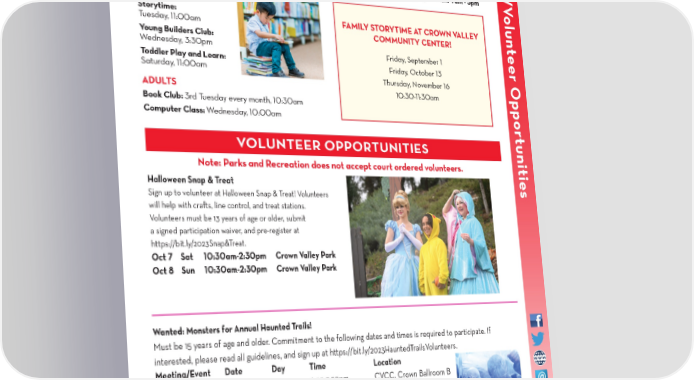 City of Laguna Niguel Directory Activity Registration Libr ionCity Hall (City Council, City Manager, Public Works, 3 Easy Ways to Register! Finance, Community Development/Planning) 30111 Crown Valley Parkway / (949) 362-4300 1 Visit the Parks and Recreation o昀케ce during ar [email protected] / business hours. CityofLagunaNiguel.org 2 Mail in your form to the Parks and Recreation LAGUNA NIGUEL PUBLIC LIBRARY y ormatHours: M-F, 8am-5pmO昀케ce at Crown Valley Park: 29751 Crown Valley 30341 Crown Valley Parkway | (949) 249-5252 | bit.ly/lnlibrary • Mon-Thu: 10am - 7pm | Fri-Sun: 9am - 5pm/V Police Services (Administrative O昀케ces Only) Parkway, Laguna Niguel, CA 92677. f30111 Crown Valley Parkway / (949) 362-4346 3 Online at CityofLagunaNiguel.org/Registration. CHILDREN olun In case of emergency, call 911 or Sheri昀昀’s Non-refundable service/convenience fees apply for Storytime: Non-Emergency Dispatch at (949) 770-6011 online registration. One form per person required.Tuesday, 11:00am FAMILY STORYTIME AT CROWN VALLEY al InHours: M-F, 8am-5pm COMMUNITY CENTER! t Crown Valley Community Center REGISTER EARLY! Early registration is strongly Young Builders Club: eer Opportunit 29751 Crown Valley Parkway/(949) 425-5100 recommended as many classes 昀椀ll up quickly. If you are Wednesday, 3:30pm Friday, September 1 a registering for the 昀椀rst time, stop by any Recreation Toddler Play and Learn: enerHours: M-F, 8am-5pm/Evenings & weekends for classes/facility to establish your account. Notice: classes may be Saturday, 11:00amFriday, October 13 Groom rentals as scheduled canceled if the minimum number of participants is not met.Thursday, November 16 Laguna Niguel Aquatics Center ADULTS 10:30-11:30am 29751 Crown Valley Parkway/(949) 425-5114 Book Club: 3rd Tuesday every month, 10:30am Hours: M-F, 8am-5pm Pool & swim hours vary/Visit CityofLagunaNiguel.org/Computer Class: Wednesday, 10:00am LapSwimReservations Sea Country Senior & Community Center VOLUNTEER OPPORTUNITIES 24602 Aliso Creek Road / (949) 425-5151 Senior Center Hours: M-F, 9am-4pm Note: Parks and Recreation does not accept court ordered volunteers. Community Center: M-Th, open for classes/room rentals ie as scheduledHalloween Snap & Treat Laguna Niguel Skate Park Niguel Botanical Preserve Sign up to volunteer at Halloween Snap & Treat! Volunteers s 27745 Alicia Parkway / (949) 916-7755 The Niguel Botanical Preserve is an 18-acre garden located will help with crafts, line control, and treat stations. Hours: School Days, 12-9:30pm; Weekends, Holidays & within Crown Valley Park and is considered a hidden jewel School Vacations: 9am-9:30pm in the City. The objective of the Preserve is to demonstrate Volunteers must be 13 years of age or older, submit the use of Mediterranean-climate, drought tolerant plants a signed participation waiver, and pre-register at Laguna Niguel Chamber of Commerce that are appropriate to our So Cal region. The Preserve 30111 Crown Valley Parkway, Suite A / (949) 363-0136 also features a Citizen of the Year Grove and Labyrinth. https://bit.ly/2023Snap&Treat. [email protected]/lnchamber.com Maps are available at the entrance of the Preserve at the Oct 7 Sat 10:30am-2:30pm Crown Valley Park top of the amphitheater. Please be aware access consists Oct 8 Sun 10:30am-2:30pm Crown Valley Park Laguna Niguel Family YMCA At Crown Valley Park of steep, partially paved and dirt paths. 29831 Crown Valley Parkway (back parking lot) For more information, please visit niguelbotanicalpreserve.org. (949) 495-9622 / ymcaoc.org/ln Laguna Niguel Library 30341 Crown Valley Parkway / (949) 249-5252 /ocpl.org/libraries/laguna-niguelWanted: Monsters for Annual Haunted Trails! Parks and Facilities Recreation facilities, amenities, Must be 15 years of age and older. Commitment to the following dates and times is required to participate. If rental information, and facility location codes are interested, please read all guidelines, and sign up at https://bit.ly/2023HauntedTrailsVolunteers. located on page 31 & 32. Meeting/Event Date Day Time Location Info Meeting Sep 20 W 6:30-7:30pm CVCC, Crown Ballroom B If you would like to ask a question, share a compliment Laguna Niguel Trail MapsEvent Training Oct 5 Th 6:30-7:30pm CVCC, Crown Ballroom B or concern, or request service from a City department The City of Laguna Niguel is home to approximately 80 Night #1 Oct 12 Th 5:30-10:00pm CVCC (including: City Council, City Manager, City Clerk, miles of scenic trails. Major trails include: Aliso Summit Trail, Community Development/Planning, Recreation, Public Colinas Blu昀昀 Trail, Laguna Ridge Trail, Long View Park Trail, Night #2 Oct 13 Fri 5:30-10:30pm CVCC Niguel Trail, Oso Creek Trail, and Salt Creek Trail. Night #3 Oct 14 Sat 5:30-10:30pm CVCC Works, and Police Services) go to CityofLagunaNiguel.org Trail Maps are available online at CityofLagunaNiguel.org/ and click on eTRAKIT in the middle of the screen or call Trails or for pick up at City Hall, Crown Valley Community Night #4 Oct 15 Sun 5:30-10:00pm CVCC City Hall at (949) 362-4300. Center, and at Sea Country Senior & Community Center. To stay up to date with Haunted Trails, follow @LNHauntedTrails on Facebook and Instagram. PARKS & RECREATION OFFICE: (949) 425-5100 PARKS & RECREATION OFFICE: (949) 425-5100 | | 2 ONLINE REGISTRATION: CityofLagunaNiguel.org/Registration REGISTRATION FORM: Page 32 ONLINE REGISTRATION: CityofLagunaNiguel.org/Registration REGISTRATION FORM: Page 323