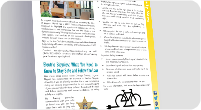 LAGUNA NIGUEL SPORTS CORNER C The City recognizes these organizations as the designated lead service providers for the various types of sports Laguna Niguel Free CYCLING RULES OF THE ommunity N ornerleagues they conduct and the age groups they serve.Featured Business ProgramROAD All cyclists (e-bike riders included) are subject to all the SOCCER same rules of the road as motorists. Cyclists who don't follow the rules are subject to ticketing and 昀椀nes as de昀椀ned AYSO Soccer Laguna Niguel Youth Soccer Association by the California Vehicle Code or Municipal Code. (Region 41)(LNYSA) ➢ T ra昀케c lights, signs, and signals apply to all road users, • Boys & Girls Ages 3-18 yrs.• Boys & Girls Ages 4-18 yrs. including bicycle riders. • Recreational and Competitive play levels, as well • Recreational, Select, and Competitive play levels, as ➢ C yclists must ride to the right edge of the road as Sports Cas divisions for individuals with special needs well as divisions for individuals with special needs practical. If you're riding slower than tra昀케c, ride in the e • Fall Season: August-November • Fall Season: August - November bike lane. You can leave the bike lane to turn left, pass w someone, avoid a road hazard or avoid cars turning • Soccer Camps Available • Soccer Camps Available right. s • Registration Information: AYSO41.org• Registration Information: lnysa.org To support local businesses and fuel our economy, the City ➢ C yclists can ride no faster than 昀椀ve mph on City of Laguna Niguel has a FREE Featured Business Program sidewalks and must yield the right-of-way to BASEBALL designed to highlight the spectacular restaurants, stores, pedestrians. Laguna Niguel Little League (LNLL)establishments, and companies that are the fabric of this ➢ R iding against the 昀氀ow of tra昀케c and weaving in and dynamic community. We are proud to feature local businesses, out of tra昀케c is prohibited. • Boys & Girls Ages 5-14 yrs.their goods, and services on our economic development ➢ When a bicycle lane is available, bicyclists are required • Fall Season: September - November website through videos and an eNewsletter. to use the bike lane unless they are traveling as fast as • Registration Information: LNLL.orgSign up for the City’s Economic Development eNewsletter at tra昀케c. LagunaNiguelBusiness.com today and be featured in a FREE ➢ It is illegal to carry passengers on your electric bicycle SOFTBALLBOCCE BALLbusiness video! unless your bike has an extra permanent seat or when Contact [email protected] or call using a child safety seat. Laguna Niguel Girls Softball (LNGS)Laguna Niguel Bocce Club (949) 362-4300 for more information about having Important Safety Practices your business spotlighted. • Girls Ages 5-14 yrs.• Men & Women Ages 18+ yrs ➢ Always wear a properly 昀椀tted bicycle helmet with the • Fall Season: September - November• Year-Round chin strap securely fastened. • Champs Division for girls with special needs • Free Bocce Lessons: Sundays at 1pm Electric Bicycles: What You Need to ➢ Learn hand signals and use them appropriately. • Registration Information: • Information: https://bocceplayers.wordpress.com/ ➢ Be aware of other road users, and try to match the lagunaniguelgirlssoftball.orgKnow to Stay Safe and Follow the Law average speed. Like many cities across south Orange County, Laguna ➢ Make eye contact with drivers before entering any VOLLEYBALLADULT CO-ED SOCCERNiguel has experienced an increase in Electric Bicycle intersection. US Youth Volleyball League (USYVL)Laguna Niguel Co-ed Soccerridership. If you or a family member ride or are considering ➢ Ride defensively – never assume others see you. riding an electric bicycle (e-bike) in and around Laguna • Boys & Girls Ages 7-15 yrs.• Men & Women Ages 18+.Niguel, please take the time to learn the rules of the road For more information, visit www.cityo昀氀agunaniguel.org/ and follow guidelines and recommendations for riding ebike • Fall Season: September - November • Year-roundsafely and legally. • Register Online: USYVL.org • Register Online: lagunaniguelfa.comBy having proactive conversations with your child or loved one, you can help keep them safe as they ride their e-bike throughout the community. Misuse or unsafe operation of an e-bike may lead to tickets and/or 昀椀nes regardless of the age of the rider(s). *Following periods of inclement weather, please call the City mudline at (949) 362-4351 for current 昀椀eld conditions. Mudline will be updated by 2:00pm on weekdays, and 7:00am on weekends. PARKS & RECREATION OFFICE: (949) 425-5100 PARKS & RECREATION OFFICE: (949) 425-5100 | | 4 ONLINE REGISTRATION: CityofLagunaNiguel.org/Registration REGISTRATION FORM: Page 32 ONLINE REGISTRATION: CityofLagunaNiguel.org/Registration REGISTRATION FORM: Page 325