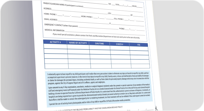 City of Laguna Niguel Contact Information: CITCITY MEETINGY MEETINGS S Get outside and tGet outside and takake a e a Parks and Recreation Department Crown Valley Park & E& EVENTVENTSS REGISTRATION FORM 29751 Crown Valley Parkway hikhike te this Fhis Fall! all! Laguna Niguel, CA 92677 SEPTEMBER 2023 ONE FORM PER PERSON REQUIRED (949) 425-5100 [email protected] SUN MON TUES WED THUR FRI SAT 1 2 PARTICIPANT’S NAME: _____________________________________________________ SEX ____ D.O.B_____/_____/_____ GRADE ________ 3 4 5 6 7 8 9 PARENT/GUARDIAN NAME (if participant is a minor): __________________________________________________________________________ ADDRESS _______________________________________________________________ CITY _______________________ ZIP ______________ 10 11 12 13 14 15 16 HOME PHONE ( _____ ) ______ - __________ WORK PHONE ( _____ ) ______ - _________ CELL PHONE ( _____ ) ______ - ___________ 17 18 19 20 21 22 23 EMAIL ADDRESS __________________________________________________________@ ___________________________________________ 24 30 24 25 26 27 28 29 EMERGENCY CONTACT (other than parent) _______________________________________________ PHONE ( _____ ) ______ - ___________ MEDICAL INFORMATION ________________________________________________________________________________________________ OCTOBER 2023 If you need special assistance, please contact the Parks and Recreation Department at least one week prior to the start of activity. SUN MON TUES WED THUR FRI SAT 1 2 3 4 5 6 7 ACTIVITY # NAME OF ACTIVITY DAY/TIME CHECK # FEE 8 9 10 11 12 13 14 15 16 17 18 19 20 21 The Fall is a perfect time to enjoy the City’s 80 22 23 24 25 26 27 28 miles of trails. Enjoy beautiful views and walks 29 30 31 throughout the City. Our trails range from 昀氀at paths, winding hills, ridges overlooking the I voluntarily agree to have myself or my child participate and I realize that every precaution is taken to eliminate any injury or hazards to myself or my child, and that NOVEMBER 2023 ocean, and even a walk through the Laguna a competent supervisor is present; however, in the event of any injury to myself or my child, I hereby waive, release and hold harmless from any liability for damages SUN MON TUES WED THUR FRI SAT Niguel Regional Park. or claims for damages for personal injury, including accidental death, as well as from claims for personal property damage which may arise in connection with the program, against the City of Laguna Niguel and all it’s o昀케cers, agents and employees. 1 2 3 4 I give consent to any X-Ray examination, anesthetic, medical or surgical diagnosis tendered under the general or special supervisor of any member of the medical Stop by any City facility to pick up a trail map sta昀昀 and emergency room sta昀昀 licensed under the Medicine Practice Act or a dentist licensed under the Dental Practice Act or the sta昀昀 of any acute General hospital 5 6 7 8 9 10 11 or check it out online at cityo昀氀agunaniguel. holding a license to operate from the California Department of Public Health. It is understood that this authorization is given in advance of diagnosis, treatments, or org/trails. For questions and more information, hospital care being required but is given to provide the aforementioned medical/dental personnel authority to render care as they deem advisable. It is understood 12 13 14 15 16 17 18 that e昀昀orts shall be made to contact the undersigned prior to rendering treatment, but that treatment will not be withheld if the undersigned cannot be reached. please call us at (949) 425-5100. I permit the use of activity/event photography and/or video of my child or myself for LN Parks & Recreation media promotion. 19 20 21 22 23 24 25 I HAVE READ AND UNDERSTAND THIS RELEASE FROM LIABILITY AND THE CANCELATION/REFUND POLICY. 26 27 28 29 30 ________________________________________________________________________________ Date _________/_________/_________ (Signature) Parent or Guardian must sign for those under 18 years of age CITY MEETINGS SPECIAL EVENTS PAYMENT INFORMATION: CITY OFFICES CLOSED ■ NAME ON CARD_____________________________________________________________________________________________________ Calendar subject to change. Visit CityofLagunaNiguel.org/Recreation CREDIT CARD NUMBER __________________________________________________________ EXP DATE _________/_________/_________ 3-DIGIT CVC CODE ______________ 32