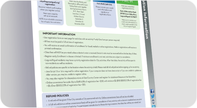 City of Laguna Niguel To Clevelandy Parks and Recreation Department Contact Information: R LegendNational Forestkwa Crown Valley Park egis apParo a dayOso Creek Trail Activity Registration Information 29751 Crown Valley Parkway # Trail Head Parkingo 0iaRkwn Laguna Niguel, CA 92677 icazarra Aliso Summit TrailAlPPadst (949) 425-5100 anopi REGISTER TODAY! Bear Brand Park TrailLultotR Ca4 EASY WAYS... [email protected] tr Mobono ail MColinas Bluff TrailCaami at rC ONLINE IN OFFICE FAX IN MAIL IN TLaguna Ridge Traily 73arkwa ion In |}þP · Long View Park TrailAliCreekValley soRoad#n 0w Register online at: Walk into the Parks and FAX (949) 249-1115 Mail your completed Niguel Trail# Cro5 cityoflagunaniguel.org/ Recreation office at Crown registration form to: 0%&'( # #0 0 Please include your credit Oso Creek Trail#Niguel Trail registration Valley Park and register card information and Parks & Recreation Dept. 0# 0 # during business hours: 0 Receive instant confirmation signature on 29751 Crown Valley Pkwy. Salt Creek Trail# f To Woods0 M-F: 8am-5pm when you register online! registration form. Laguna Niguel, CA 92677 City ParksCanyonlinas Sat/Sun: Closed ormat DeCo New users need to Holiday Closures: #eo set up an account. Make sure to include your 0s September 4 credit card information or a a# P0 NOTE: A non-refundable convenience November 10 check, made payable to the fee will apply. See scale below. November 23-24 City of Laguna Niguel. Aliso Summit Trail# ion 0 Colinas Bluff Trail IMPORTANT INFORMATION ## • Use registration form on next page for activities with an activity # only! One form per person required. 00 # • All fees must be paid in full at time of registration. # 0 H0 # i0 ghSalt Creek Trail# la0 • You will receive an email con昀椀rmation of enrollment for faxed, mailed or online registrations. Walk-in registrations will receive a nds Aven printed con昀椀rmation. ues Drive #ill • Class fees will NOT be pro-rated unless a doctor’s note is received. Doctor’s note must be received before the last day of class. 0H# na0 i MarG • Register early. Enrollment in classes is limited. If minimum enrollment is not met, activities are subject to cancelation. #old 0e • Laguna Niguel residents may have a priority registration date for City activities. After that date, the activity will be open to n Lan non-residents as well as residents. t Laguna Ridge Trail #ern • Refund policies are speci昀椀c to the location where the activity is held. Please read all refund policies before signing up for an activity. # 0 • Java Script 1.5 or 1.6 is required for online registration. If your computer does not have Java script or if you are unable to update an 0## 00 older version, you may be unable to register online. # 0 • You may also register for classes/excursions at Sea Country Center and register for skateboard lessons at the Skate Park. Bear Brand Park Trail# • Online convenience fee scale: (Up to $149) 6.5% of registration fee + $.50, with minimum $2; ($150-$500) 3.5% of registration fee #0 0# + $5; (Over $500) 2.5% of registration fee + $10. #0 0 PacificLong View Trail REFUND POLICIES Island D# • A r efund will be given if the City cancels a City sponsored activity. Online convenience fees will not be refunded. riv0 e# • A full r efund (minus online convenience fees) will be given for cancelation of any activity with a doctor’s medical excuse prior To Salt Creek0d BeachRoa to the commencement of activity. If a participant cancels due to illness during a session, the class fee will be pro-rated, but on ell Avi the note must be received before the last day of class. iguo De NCamin • No refunds will be issued for no-shows, special events or excursions. • Activities with an activity # are only transferable to another activity with an activity # and are based on availability. Laguna Niguel Trails • If patron cancels 昀椀ve (5) or more business days prior to the activity, patron will receive a refund, minus a $10 transaction fee. 00.250.51City of Laguna Niguel Trails±• A cancelation made four (4) or less business days prior to the activity will result in the forfeiture of the entire class fee. Miles • No fee for transfers into another activity with an activity number. Detailed trail information is available at: www.cityoflagunaniguel.org/trailsDate: 1/24/2017• No fee for a non-refundable credit on your ActiveNet account. PARKS & RECREATION OFFICE: (949) 425-5100 PARKS & RECREATION OFFICE: (949) 425-5100 | | 30 ONLINE REGISTRATION: CityofLagunaNiguel.org/Registration REGISTRATION FORM: Page 32 ONLINE REGISTRATION: CityofLagunaNiguel.org/Registration REGISTRATION FORM: Page 32 31
