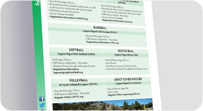 LAGUNA NIGUEL SPORTS CORNER C The City recognizes these organizations as the designated lead service providers for the various types of sports Laguna Niguel Free CYCLING RULES OF THE ommunity N ornerleagues they conduct and the age groups they serve. Featured Business Program ROAD All cyclists (e-bike riders included) are subject to all the SOCCER same rules of the road as motorists. Cyclists who don't follow the rules are subject to ticketing and 昀椀nes as de昀椀ned AYSO Soccer Laguna Niguel Youth Soccer Association by the California Vehicle Code or Municipal Code. (Region 41) (LNYSA) ➢ T ra昀케c lights, signs, and signals apply to all road users, • Boys & Girls Ages 3-18 yrs. • Boys & Girls Ages 4-18 yrs. including bicycle riders. • Recreational and Competitive play levels, as well • Recreational, Select, and Competitive play levels, as ➢ C yclists must ride to the right edge of the road as Sports C as divisions for individuals with special needs well as divisions for individuals with special needs practical. If you're riding slower than tra昀케c, ride in the e • Fall Season: August-November • Fall Season: August - November bike lane. You can leave the bike lane to turn left, pass w someone, avoid a road hazard or avoid cars turning • Soccer Camps Available • Soccer Camps Available right. s • Registration Information: AYSO41.org • Registration Information: lnysa.org To support local businesses and fuel our economy, the City ➢ C yclists can ride no faster than 昀椀ve mph on City of Laguna Niguel has a FREE Featured Business Program sidewalks and must yield the right-of-way to BASEBALL designed to highlight the spectacular restaurants, stores, pedestrians. Laguna Niguel Little League (LNLL) establishments, and companies that are the fabric of this ➢ R iding against the 昀氀ow of tra昀케c and weaving in and dynamic community. We are proud to feature local businesses, out of tra昀케c is prohibited. • Boys & Girls Ages 5-14 yrs. their goods, and services on our economic development ➢ When a bicycle lane is available, bicyclists are required • Fall Season: September - November website through videos and an eNewsletter. to use the bike lane unless they are traveling as fast as • Registration Information: LNLL.org Sign up for the City’s Economic Development eNewsletter at tra昀케c. LagunaNiguelBusiness.com today and be featured in a FREE ➢ It is illegal to carry passengers on your electric bicycle SOFTBALL BOCCE BALL business video! unless your bike has an extra permanent seat or when Contact [email protected] or call using a child safety seat. Laguna Niguel Girls Softball (LNGS) Laguna Niguel Bocce Club (949) 362-4300 for more information about having Important Safety Practices your business spotlighted. • Girls Ages 5-14 yrs. • Men & Women Ages 18+ yrs ➢ Always wear a properly 昀椀tted bicycle helmet with the • Fall Season: September - November • Year-Round chin strap securely fastened. • Champs Division for girls with special needs • Free Bocce Lessons: Sundays at 1pm Electric Bicycles: What You Need to ➢ Learn hand signals and use them appropriately. • Registration Information: • Information: https://bocceplayers.wordpress.com/ ➢ Be aware of other road users, and try to match the lagunaniguelgirlssoftball.org Know to Stay Safe and Follow the Law average speed. Like many cities across south Orange County, Laguna ➢ Make eye contact with drivers before entering any VOLLEYBALL ADULT CO-ED SOCCER Niguel has experienced an increase in Electric Bicycle intersection. US Youth Volleyball League (USYVL) Laguna Niguel Co-ed Soccer ridership. If you or a family member ride or are considering ➢ Ride defensively – never assume others see you. riding an electric bicycle (e-bike) in and around Laguna • Boys & Girls Ages 7-15 yrs. • Men & Women Ages 18+. Niguel, please take the time to learn the rules of the road For more information, visit www.cityo昀氀agunaniguel.org/ and follow guidelines and recommendations for riding ebike • Fall Season: September - November • Year-round safely and legally. • Register Online: USYVL.org • Register Online: lagunaniguelfa.com By having proactive conversations with your child or loved one, you can help keep them safe as they ride their e-bike throughout the community. Misuse or unsafe operation of an e-bike may lead to tickets and/or 昀椀nes regardless of the age of the rider(s). *Following periods of inclement weather, please call the City mudline at (949) 362-4351 for current 昀椀eld conditions. Mudline will be updated by 2:00pm on weekdays, and 7:00am on weekends. PARKS & RECREATION OFFICE: (949) 425-5100 PARKS & RECREATION OFFICE: (949) 425-5100 | | 4 ONLINE REGISTRATION: CityofLagunaNiguel.org/Registration REGISTRATION FORM: Page 32 ONLINE REGISTRATION: CityofLagunaNiguel.org/Registration REGISTRATION FORM: Page 32 5