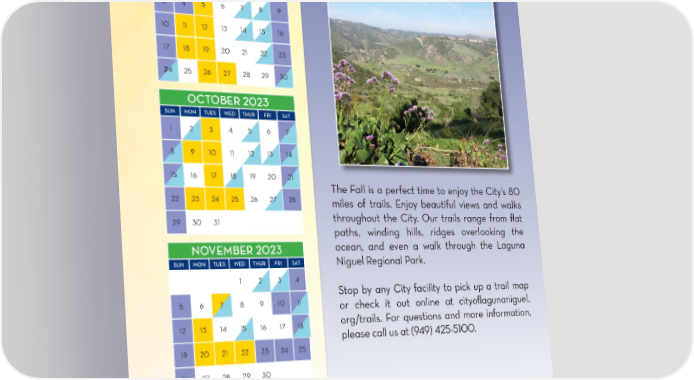 City of Laguna Niguel Contact Information:CITCITY MEETINGY MEETINGS S Get outside and tGet outside and takake a e a Parks and Recreation DepartmentCrown Valley Park & E& EVENTVENTSS REGISTRATION FORM29751 Crown Valley Parkway hikhike te this Fhis Fall! all! Laguna Niguel, CA 92677 SEPTEMBER 2023 ONE FORM PER PERSON REQUIRED(949) 425-5100 [email protected] TUES WED THUR FRI SAT 1 2 PARTICIPANT’S NAME: _____________________________________________________ SEX ____ D.O.B_____/_____/_____ GRADE ________ 3 4 5 6 7 8 9 PARENT/GUARDIAN NAME (if participant is a minor): __________________________________________________________________________ ADDRESS _______________________________________________________________ CITY _______________________ ZIP ______________10111213141516 HOME PHONE ( _____ ) ______ - __________ WORK PHONE ( _____ ) ______ - _________ CELL PHONE ( _____ ) ______ - ___________ 17181920212223 EMAIL ADDRESS __________________________________________________________@ ___________________________________________2430 24 25 26 27 28 29 EMERGENCY CONTACT (other than parent) _______________________________________________ PHONE ( _____ ) ______ - ___________ MEDICAL INFORMATION ________________________________________________________________________________________________OCTOBER 2023 If you need special assistance, please contact the Parks and Recreation Department at least one week prior to the start of activity.SUNMON TUES WED THURFRISAT 1 2 3 4 5 6 7 ACTIVITY #NAME OF ACTIVITYDAY/TIMECHECK # FEE 8 9 10 11 12 13 14 15 16 17 18 19 20 21 The Fall is a perfect time to enjoy the City’s 80 22 23 24 25 26 27 28 miles of trails. Enjoy beautiful views and walks 29 30 31 throughout the City. Our trails range from 昀氀at paths, winding hills, ridges overlooking the I voluntarily agree to have myself or my child participate and I realize that every precaution is taken to eliminate any injury or hazards to myself or my child, and that NOVEMBER 2023ocean, and even a walk through the Laguna a competent supervisor is present; however, in the event of any injury to myself or my child, I hereby waive, release and hold harmless from any liability for damages SUNMON TUESWED THURFRISATNiguel Regional Park. or claims for damages for personal injury, including accidental death, as well as from claims for personal property damage which may arise in connection with the program, against the City of Laguna Niguel and all it’s o昀케cers, agents and employees.1234 I give consent to any X-Ray examination, anesthetic, medical or surgical diagnosis tendered under the general or special supervisor of any member of the medical Stop by any City facility to pick up a trail map sta昀昀 and emergency room sta昀昀 licensed under the Medicine Practice Act or a dentist licensed under the Dental Practice Act or the sta昀昀 of any acute General hospital 567891011or check it out online at cityo昀氀agunaniguel. holding a license to operate from the California Department of Public Health. It is understood that this authorization is given in advance of diagnosis, treatments, or org/trails. For questions and more information, hospital care being required but is given to provide the aforementioned medical/dental personnel authority to render care as they deem advisable. It is understood 12131415161718 that e昀昀orts shall be made to contact the undersigned prior to rendering treatment, but that treatment will not be withheld if the undersigned cannot be reached.please call us at (949) 425-5100. I permit the use of activity/event photography and/or video of my child or myself for LN Parks & Recreation media promotion.19202122232425 I HAVE READ AND UNDERSTAND THIS RELEASE FROM LIABILITY AND THE CANCELATION/REFUND POLICY. 2627282930 ________________________________________________________________________________ Date _________/_________/_________ (Signature) Parent or Guardian must sign for those under 18 years of ageCITY MEETINGS SPECIAL EVENTS PAYMENT INFORMATION: CITY OFFICES CLOSED ■ NAME ON CARD_____________________________________________________________________________________________________Calendar subject to change. Visit CityofLagunaNiguel.org/Recreation CREDIT CARD NUMBER __________________________________________________________ EXP DATE _________/_________/_________ 3-DIGIT CVC CODE ______________ 32