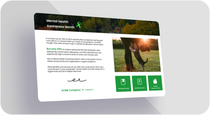 Benefits Resource Centre Benefits Summary Hire Benefits Guide In a recent survey, 92% of CEOs reported their companies had focused more efforts on mental health as a result of the pandemic. And 96% thought they were doing enough to address employees' mental health. But only 69% of workers questioned felt their employers were addressing mental health adequately. And 48% indicated they had experienced high to extreme levels of stress over the past year. May is Mental Health Awareness Month, which is the perfect time to assess and promote your organization's support programs. What benefits and services do you offer that could assist? Show your commitment to your employees' mental health and well-being with a Digital Postcard full of helpful resources. ACME Company Contact Us Mental Health Awareness Month