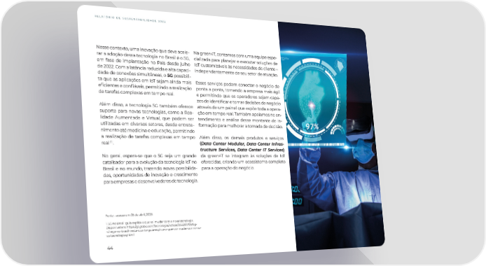 RELATÓRIO DE SUSTENTABILIDADE 2022 Nesse contexto, uma inovação que deve acele- Na green4T, contamos com uma equipe espe- rar a adoção dessa tecnologia no Brasil é o 5G, cializada para planejar e executar soluções de em fase de implantação no País desde julho IoT customizáveis às necessidades do cliente – de 2022. Com a latência reduzida e alta capaci- independentemente de seu setor de atuação. dade de conexões simultâneas, o 5G possibili- ta que as aplicações em IoT sejam ainda mais Esses serviços podem conectar o negócio de e昀椀cientes e con昀椀áveis, permitindo a realização ponta a ponta, tornando a empresa mais ágil de tarefas complexas em tempo real. e permitindo que os operadores sejam capa- zes de identi昀椀car e tomar decisões de negócio Além disso, a tecnologia 5G também oferece através de um painel que expõe toda a opera- suporte para novas tecnologias, como a Rea- ção em tempo real. Também apoiamos no en- lidade Aumentada e Virtual, que podem ser tendimento e análise desse montante de in- utilizadas em diversos setores, desde entrete- formação para melhorar a tomada de decisão. nimento até medicina e educação, permitindo a realização de tarefas complexas em tempo Além disso, os demais produtos e serviços (1) real . (Data Center Modular, Data Center Infras- tructure Services, Data Center IT Services) No geral, espera-se que o 5G seja um grande da green4T se integram às soluções de IoT catalisador para a evolução da tecnologia IoT no oferecidas, criando um ecossistema completo Brasil e no mundo, trazendo novas possibilida- para a operação do negócio. des, oportunidades de inovação e crescimento para empresas e desenvolvedores de tecnologia. Fonte - acesso em 05 de abril, 2023: 1. 5G no Brasil: guia explica o que vai mudar com a nova tecnologia. Disponível em: https://g1.globo.com/tecnologia/noticia/2022/07/06/5g- -chega-ao-brasil-nesta-quarta-guia-explica-o-que-vai-mudar-com-a-no- va-tecnologia.ghtml 44