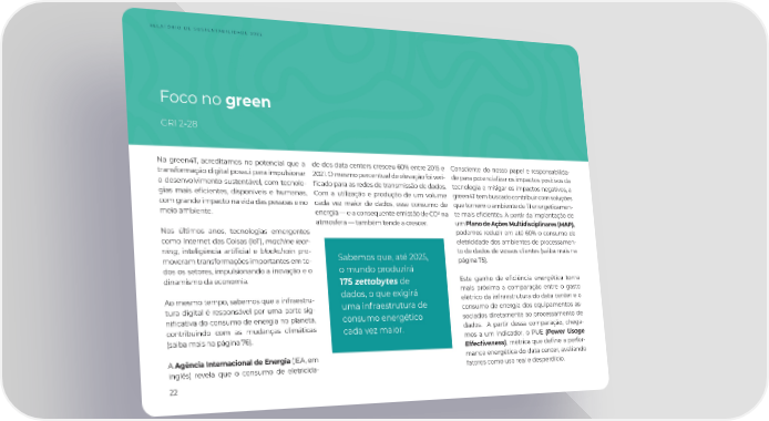 RELATÓRIO DE SUSTENTABILIDADE 2022 Foco no green GRI 2-28 Na green4T, acreditamos no potencial que a de dos data centers cresceu 60% entre 2015 e Consciente do nosso papel e responsabilida- transformação digital possui para impulsionar 2021. O mesmo percentual de elevação foi veri- de para potencializar os impactos positivos da o desenvolvimento sustentável, com tecnolo- 昀椀cado para as redes de transmissão de dados. tecnologia e mitigar os impactos negativos, a gias mais e昀椀cientes, disponíveis e humanas, Com a utilização e produção de um volume green4T tem buscado contribuir com soluções com grande impacto na vida das pessoas e no cada vez maior de dados, esse consumo de que tornem o ambiente de TI energeticamen- 2 meio ambiente. energia — e a consequente emissão de CO na te mais e昀椀cientes. A partir da implantação de atmosfera — também tende a crescer. um Plano de Ações Multidisciplinares (MAP), Nos últimos anos, tecnologias emergentes podemos reduzir em até 60% o consumo de como Internet das Coisas (IoT), machine lear- eletricidade dos ambientes de processamen- ning, inteligência arti昀椀cial e blockchain pro- Sabemos que, até 2025, to de dados de nossos clientes (saiba mais na moveram transformações importantes em to- página 75). dos os setores, impulsionando a inovação e o o mundo produzirá dinamismo da economia. 175 zettabytes de Este ganho de e昀椀ciência energética torna dados, o que exigirá mais próxima a comparação entre o gasto Ao mesmo tempo, sabemos que a infraestru- uma infraestrutura de elétrico da infraestrutura do data center e o tura digital é responsável por uma parte sig- consumo de energia dos equipamentos as- ni昀椀cativa do consumo de energia no planeta, consumo energético sociados diretamente ao processamento de contribuindo com as mudanças climáticas cada vez maior. dados. A partir dessa comparação, chega- (saiba mais na página 76). mos a um indicador, o PUE (Power Usage Effectiveness), métrica que de昀椀ne a perfor- A Agência Internacional de Energia (IEA, em mance energética do data center, avaliando inglês) revela que o consumo de eletricida- fatores como uso real e desperdício. 22