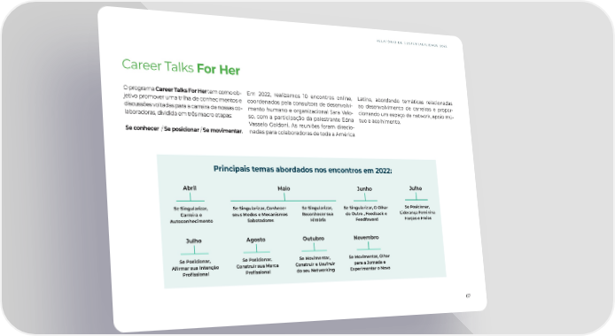 RELATÓRIO DE SUSTENTABILIDADE 2022 Career Talks For Her O programa Career Talks For Her tem como ob- Em 2022, realizamos 10 encontros online, Latina, abordando temáticas relacionadas jetivo promover uma trilha de conhecimentos e coordenados pela consultora de desenvolvi- ao desenvolvimento de carreiras e propor- discussões voltadas para a carreira de nossas co- mento humano e organizacional Sara Velo- cionando um espaço de network, apoio mú- laboradoras, dividida em três macro etapas: so, com a participação da palestrante Edna tuo e acolhimento. Vasselo Goldoni. As reuniões foram direcio- Se conhecer / Se posicionar / Se movimentar. nadas para colaboradoras de toda a América Principais temas abordados nos encontros em 2022: Abril Maio Junho Julho Se Singularizar, Se Singularizar, Conhecer Se Singularizar, Se Singularizar, O Olhar Se Posicionar, Carreira e seus Medos e Mecanismos Reconhecer sua do Outro , Feedback e Liderança Feminina Autoconhecimento Sabotadores História Feedfoward Forças e Freios Julho Agosto Outubro Novembro Se Posicionar, Se Posicionar, Se Movimentar, Se Movimentar, Olhar A昀椀rmar sua Intenção Construir sua Marca Construir e Usufruir para a Jornada e Pro昀椀ssional Pro昀椀ssional do seu Networking Experimentar o Novo 67