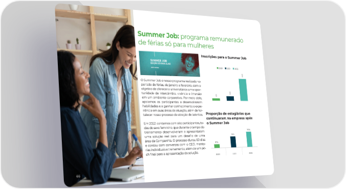RELATÓRIO DE SUSTENTABILIDADE 2022 Summer Job: programa remunerado de férias só para mulheres Inscrições para o Summer Job 2020 2021 2022 3 3 8 O Summer Job é nosso programa realizado no período de férias, de janeiro a fevereiro, com o objetivo de oferecer a universitários uma opor- 6 6 tunidade de intercâmbio, vivência e imersão 3 1 em um ambiente corporativo. Por meio dele, 8 apoiamos os participantes a desenvolverem habilidades e a ganhar conhecimento e expe- riência em suas áreas de atuação, além de for- Proporção de estagiárias que talecer nosso processo de atração de talentos. continuaram na empresa após Em 2022, contamos com oito participantes, to- o Summer Job das do sexo feminino, que durante o tempo do treinamento desenvolveram e apresentaram 70% uma solução real para um desa昀椀o de uma 50% área da Companhia. O processo durou 60 dias e contou com conversas com o CEO, mento- 17% rias individuais e treinamento, além de um pit- ch 昀椀nal para a apresentação da solução. 2020 2021 2022 66