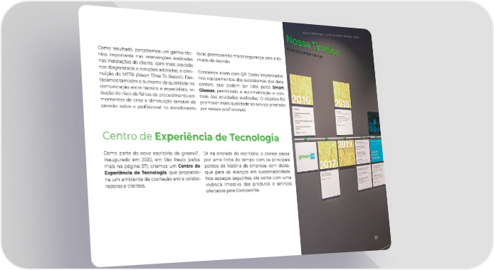 RELATÓRIO DE SUSTENTABILIDADE 2022 Como resultado, percebemos um ganho téc- local, promovendo maior segurança para a to- nico importante nas intervenções realizadas mada de decisão. nas instalações do cliente, com mais precisão nos diagnósticos e soluções adotadas, e dimi- Contamos ainda com QR Codes implantados nuição do MTTR (Mean Time To Repair). Des- nos equipamentos dos subsistemas dos data tacamos também o aumento da qualidade na centers, que podem ser lidos pelos Smart comunicação entre técnico e especialista, re- Glasses, permitindo a automatização e con- dução do risco de falhas de procedimento em trole das atividades realizadas. O objetivo foi momentos de crise e diminuição sensível da promover mais qualidade ao serviço prestado pressão sobre o pro昀椀ssional no atendimento por nossos pro昀椀ssionais. Centro de Experiência de Tecnologia Como parte do novo escritório da green4T, Já na entrada do escritório, o cliente passa inaugurado em 2022, em São Paulo (saiba por uma linha do tempo com os principais mais na página 57), criamos um Centro de pontos da história da empresa, com desta- Experiência de Tecnologia, que proporcio- que para os avanços em sustentabilidade. na um ambiente de cocriação entre colabo- Nos espaços seguintes, ele conta com uma radores e clientes. vivência imersiva dos produtos e serviços ofertados pela Companhia. 37
