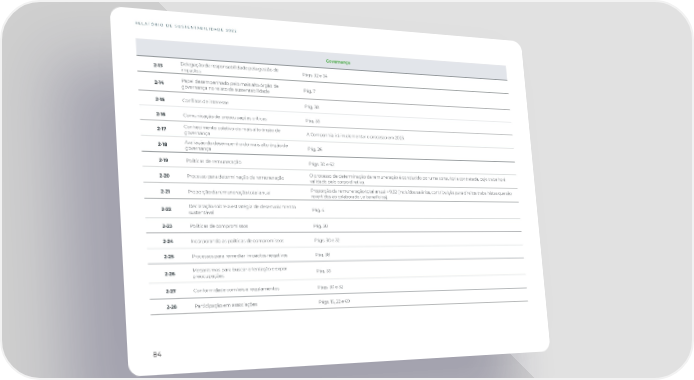 RELATÓRIO DE SUSTENTABILIDADE 2022 Governança 2-13 Delegação de responsabilidade pela gestão de Págs. 32 e 34 impactos 2-14 Papel desempenhado pelo mais alto órgão de Pág. 7 governança no relato de sustentabilidade 2-15 Con昀氀itos de interesse Pág. 30 2-16 Comunicação de preocupações críticas Pág. 33 2-17 Conhecimento coletivo do mais alto órgão de A Companhia irá implementar o processo em 2023. governança 2-18 Avaliação do desempenho do mais alto órgão de Pág. 26 governança 2-19 Políticas de remuneração Págs. 30 e 62 2-20 Processo para determinação da remuneração O processo de determinação da remuneração é conduzido por uma consultoria contratada, cujo trabalho é validado pelo corpo diretivo. 2-21 Proporção da remuneração total anual Proporção da remuneração total anual = 9,32 (incluídos salários, contribuição para direitos trabalhistas que são revertidos ao colaborador, e benefícios). 2-22 Declaração sobre a estratégia de desenvolvimento Pág. 4 sustentável 2-23 Políticas de compromissos Pág. 30 2-24 Incorporando as políticas de compromissos Págs. 30 e 32 2-25 Processos para remediar impactos negativos Pág. 38 2-26 Mecanismos para buscar orientação e expor Pág. 33 preocupações 2-27 Conformidade com leis e regulamentos Págs. 30 e 32 2-28 Participação em associações Págs. 15, 22 e 69 84