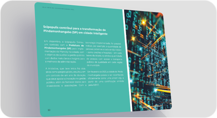RELATÓRIO DE SUSTENTABILIDADE 2022 Scipopulis contribui para a transformação de Pindamonhangaba (SP) em cidade inteligente Em dezembro, a Scipopulis 昀椀rmou tecnologia implementada, foi possível um contrato com a Prefeitura de indicar, por exemplo, a quantidade de Pindamonhangaba (SP) para imple- pessoas próximas a cada serviço básico mentação do Plancity na cidade, com – como creches e hospitais – em cada o objetivo de auxiliar a gestão pública bairro da cidade, ou ainda a quantidade com dados mais claros e insights para de pessoas com acesso a transporte a melhoria da administração. público de qualidade em cada região do município. A iniciativa, que teve início há dois anos como projeto piloto, resultou em Em fevereiro de 2023, a cidade de Pinda- um contrato de um ano de duração, monhangaba passou a ser reconhecida que deve apoiar a inovação na gestão o昀椀cialmente como uma smart city, a pública, além de fornecer dados para partir de uma certi昀椀cação emitida investidores e associações. Com a pela ABNT. 50