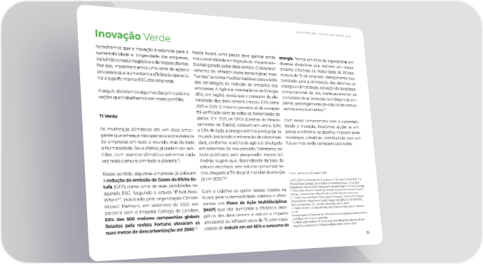 RELATÓRIO DE SUSTENTABILIDADE 2022 Inovação Verde Acreditamos que a inovação é essencial para a Nesta busca, uma pauta deve ganhar ainda energia. Temos um time de especialistas em sustentabilidade e longevidade das empresas, mais centralidade: a mitigação do impacto am- diversas disciplinas que realizam um mape- incluindo o nosso negócio e o de nossos clientes. biental gerado pelos data centers. O desenvol- amento criterioso da maturidade da infraes- Por isso, implementamos uma série de ações e vimento de infraestruturas tecnológicas mais trutura de TI da empresa; planejamento cus- processos que aumentam a e昀椀ciência operacio- “verdes” se torna medida inadiável para o êxito tomizado para a otimização dos sistemas de nal e a performance ESG das empresas. das estratégias de redução de emissões das energia e climatização, elevação da densidade empresas. A Agência Internacional de Energia computacional do site, enclausuramento de A seguir, abordamos algumas das principais ino- (IEA, em inglês) revela que o consumo de ele- corredores de ar, evolução tecnológica do am- vações que trabalhamos em nosso portfólio. tricidade dos data centers cresceu 60% entre biente, prolongamento de vida útil de compo- [5] 2015 e 2021. O mesmo percentual de elevação nentes e equipamentos . foi veri昀椀cado para as redes de transmissão de TI Verde dados. Em 2021, os CPDs (Centros de Proces- Com nosso compromisso com a sustentabi- samento de Dados) consumiram entre 0,9% lidade e inovação, buscamos ajudar as em- As mudanças climáticas são um risco emer- e 1,3% de toda a energia elétrica produzida no presas a enfrentar os desa昀椀os impostos pelas gente que ameaça não apenas a sobrevivência mundo (excluindo a mineração de criptomoe- mudanças climáticas, contribuindo para um de empresas em todo o mundo, mas de toda das), conforme relatório da agência divulgado futuro mais verde e próspero para todos. a humanidade. Seus efeitos já podem ser sen- em setembro do ano passado. Entretanto, es- tidos, com eventos climáticos extremos cada tudo publicado pelo pesquisador Anders S.G [1] vez mais comuns em todo o planeta . Andrae sugere que, dependendo da base de cálculo escolhida, este volume consumido te- Nesse sentido, algumas empresas já colocam nha chegado a 7% do grid mundial de energia Fontes - acesso em 05 de abril, 2023: [3,4] a redução de emissão de Gases do Efeito Es- já em 2020 . 1. IPCC, 2021: Summary for Policymakers. In: Climate Change 2021: The tufa (GEE) como uma de suas prioridades na Physical Science Basis. Contribution of Working Group I to the Sixth agenda ESG. Segundo o estudo “If Not Now, Com o objetivo de apoiar nossos clientes na Assessment Report of the Intergovernmental Panel on Climate Change 2. “If Not Now, When?” Report by Climate Impact Partners and Imperial When?”, publicado pela organização Climate busca pela sustentabilidade, criamos e ofere- College. Disponível em: https://ifnotnowwhen.climateimpact.com 3. “Total Consumer Power Consumption Forecast”. Anders S.G. Andrea. Impact Partners, em setembro de 2022, em cemos um Plano de Ação Multidisciplinar Disponível em: https://www.researchgate.net/publication/342643762_ parceria com o Imperial College, de Londres, (MAP) que visa aumentar a e昀椀ciência ener- New_perspectives_on_internet_electricity_use_in_2030 4. “Data centers: How big are they, and what are they worth?”. Interna- 63% das 500 maiores companhias globais gética dos data centers e reduzir o impacto tional Energy Agency. Disponível em: https://www.iea.org/reports/data-centres- listadas pela revista Fortune elevaram as ambiental da infraestrutura de TI, com capa- and-data-transmission-networks [2] 5. Informações sobre o Plano de Ação Multidisciplinar disponíveis em: suas metas de descarbonização até 2050 . cidade de reduzir em até 60% o consumo de https://www.green4t.com/solucoes/data-center-carbon-zero/ 39