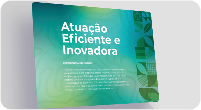 Atuação E昀椀ciente e Inovadora EXPERIÊNCIA DO CLIENTE A green4T se compromete em oferecer soluções tecnológicas para garantir a alta disponibilidade, resiliência, segurança, e昀椀ciência e sustentabilidade da infraestrutura de TI de seus clientes. Com a aceleração da transformação digital e a consolidação da economia 4.0, entendemos que nossos serviços são essenciais para que as empresas assegurem suas operações críticas, baseadas no processamento de dados.