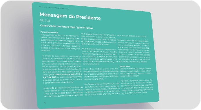 RELATÓRIO DE SUSTENTABILIDADE 2022 Mensagem do Presidente GRI 2-22 Construindo um futuro mais “green” juntos 5 Panorama mundial res de elevação de risco para a economia global saltou de 3% em 2020 para 13,75% em 2022 . Em 2022, empresas de todo o mundo foram le- estão relacionados ao clima: eventos extremos, vadas a buscar mecanismos de adaptação de colapso de ecossistemas e falhas nas medidas Todo este contexto levou os países, seus gover- suas atividades e modelos de negócios frente de mitigação das emissões poderão causar des- nantes e lideranças empresariais a testarem a dois temas potentes e interligados que do- gates importantes no PIB das nações. suas capacidades de adaptação e resposta minaram o debate – e as tensões – globais no ante ao cenário desa昀椀ador colocado em 2022. período: a crise climática e a desaceleração da Além da ameaça climática, a atividade econô- Uma realidade que impulsionou as corpora- economia. mica em 2022 sofreu com a quebra na cadeia ções a uma busca por soluções sustentáveis, de suprimentos, provocada pela pandemia de inovações e práticas responsáveis, gerando No âmbito do clima, relatórios emitidos pelos Covid (2020/2021), e os efeitos do con昀氀ito mili- benefícios não apenas para o meio ambiente cientistas e ambientalistas do Painel Inter- tar entre a Rússia e a Ucrânia, iniciado em fe- e a sociedade, mas também para o desempe- governamental sobre Mudanças Climáticas vereiro, sobre o abastecimento de energia no nho, e昀椀ciência e resiliência dos negócios. 3 (IPCC, da sigla em inglês) alertaram para o im- continente europeu . pacto negativo da manutenção dos atuais ní- Oportunidade veis de emissões de gases do efeito estufa por Como efeito imediato, vivemos uma forte Dessa forma, o ano de 2022 reforçou a necessi- parte dos países. No ritmo vigente, a tempe- pressão in昀氀acionária global de 8,8%, de acordo dade de empresas, cidades e nações estarem ratura global poderá aumentar entre 1,5°C e com o relatório World Economic Outlook, pu- melhor preparadas para seguirem 昀椀rmes em 4,4°C até 2100, gerando consequências como blicado em janeiro de 2023 pelo Fundo Mone- suas jornadas de evolução. 4 a elevação do nível do mar em até um metro e tário Internacional (FMI) . 1 a perda de 99% dos recifes de coral. Respostas importantes foram dadas. Por Nos Estados Unidos, a in昀氀ação atingiu o pico exemplo, o anúncio de investimentos públi- Ainda neste escopo de análise, os re昀氀exos não de 7%, fechando 2022 em quatro pontos per- cos vultosos em infraestrutura sustentável 昀椀carão restritos ao meio ambiente. O estudo centuais. No bloco europeu, ultrapassou 9%. e na aceleração de projetos de geração de Global Risks Report 2023, do Fórum Econômico No Brasil, a escalada veio um ano antes e bateu energia limpa e renovável por parte de paí- 2 Mundial , indica que três dos cinco maiores fato- os 10%. Como reação, a taxa de juros no País ses da Europa e os Estados Unidos. 4