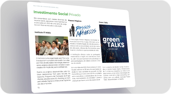 RELATÓRIO DE SUSTENTABILIDADE 2022 Investimento Social Privado Em consonância com nossas diretrizes de Passos Mágicos Green Talks impacto social, apoiamos e acompanhamos a conclusão em 2022 de uma série de proje- tos com foco na inclusão e educação. Instituto IT Mídia A Associação Passos Mágicos, localizada no município de Embu-Guaçu (SP), tem como missão a transformação da vida de jovens e crianças em vulnerabilidade social por meio da educação, oferecendo ferramentas para levá-los a melhores oportunidades de vida. A Instituição oferece aulas de português, O Instituto é uma organização sem 昀椀ns lucra- matemática e inglês no contraturno esco- tivos que tem o propósito de transformar vidas lar, além de acompanhamento psicológico e por meio da educação e tecnologia, desenvol- psicopedagógico, atividades culturais e bol- vendo projetos educacionais voltados à capa- sas de estudo. citação e formação de jovens pro昀椀ssionais. Em setembro de 2022, 昀椀nanciamos um even- Com o objetivo de debater temas relaciona- Dentre os projetos desenvolvidos pelo Ins- to para celebrar os 30 anos da associação, se- dos à transformação digital, infraestrutura tituto destacamos: Tech para Inclusão, Eu diado no novo escritório da green4T, em São de TI, e昀椀ciência energética da indústria de Capacito, Programa de Formação de Enge- Paulo (SP), que reuniu cerca de 170 convidados data centers, smart cities e tecnologias dis- nheiros, estudos sobre 5G, Ranking de Com- entre executivos e colaboradores da Compa- ruptivas como IoT e edge computing, con- petitividade Digital e o Manual de Digitaliza- nhia, representantes da entidade e jovens e tamos com um podcast chamado “Green ção das empresas. crianças que fazem parte do projeto social. Talks”, disponibilizado no Spotify. 72