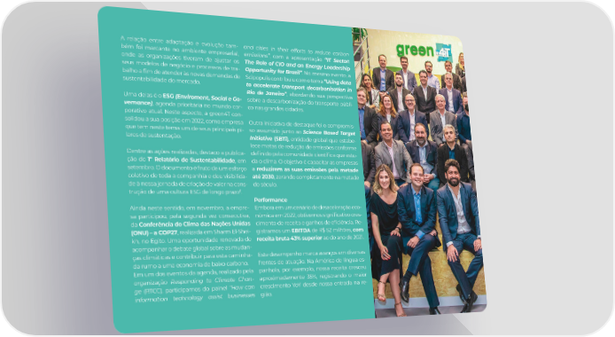 RELATÓRIO DE SUSTENTABILIDADE 2022 A relação entre adaptação e evolução tam- and cities in their efforts to reduce carbon bém foi marcante no ambiente empresarial, emissions”, com a apresentação “IT Sector: onde as organizações tiveram de ajustar os The Role of CIO and an Energy Leadership seus modelos de negócio e processos de tra- Opportunity for Brazil”. No mesmo evento, a balho a 昀椀m de atender às novas demandas de Scipopulis contribuiu com o tema “Using data sustentabilidade do mercado. to accelerate transport decarbonisation in Rio de Janeiro”, abordando sua perspectiva Uma delas é o ESG (Enviroment, Social e Go- sobre a descarbonização do transporte públi- vernance), agenda prioritária no mundo cor- co nas grandes cidades. porativo atual. Neste aspecto, a green4T con- solidou a sua posição em 2022, como empresa Outra iniciativa de destaque foi o compromis- que tem neste tema um de seus principais pi- so assumido junto ao Science Based Target lares de sustentação. Initiative (SBTi), entidade global que estabe- lece metas de redução de emissões conforme Dentre as ações realizadas, destaco a publica- de昀椀nido pela comunidade cientí昀椀ca que estu- ção do 1º Relatório de Sustentabilidade, em da o clima. O objetivo é capacitar as empresas setembro. O documento é fruto de um esforço a reduzirem as suas emissões pela metade coletivo de toda a companhia e deu visibilida- até 2030, zerando completamente na metade de à nossa jornada de criação de valor na cons- do século. 6 trução de uma cultura ESG de longo prazo . Performance Ainda neste sentido, em novembro, a empre- Embora em um cenário de desaceleração eco- sa participou, pela segunda vez consecutiva, nômica em 2022, obtivemos signi昀椀cativo cres- da Conferência do Clima das Nações Unidas cimento de receita e ganhos de e昀椀ciência. Re- (ONU) – a COP27, realizada em Sharm El-Shei- gistramos um EBITDA de R$ 52 milhões, com kh, no Egito. Uma oportunidade renovada de receita bruta 43% superior ao do ano de 2021. acompanhar o debate global sobre as mudan- ças climáticas e contribuir para esta caminha- Este desempenho marca avanços em diversas da rumo a uma economia de baixo carbono. frentes de atuação. Na América de língua es- Em um dos eventos da agenda, realizado pela panhola, por exemplo, nossa receita cresceu organização Responding to Climate Chan- aproximadamente 35%, registrando o maior ge (RTCC), participamos do painel “How can crescimento YoY desde nossa entrada na re- information technology assist businesses gião. 55